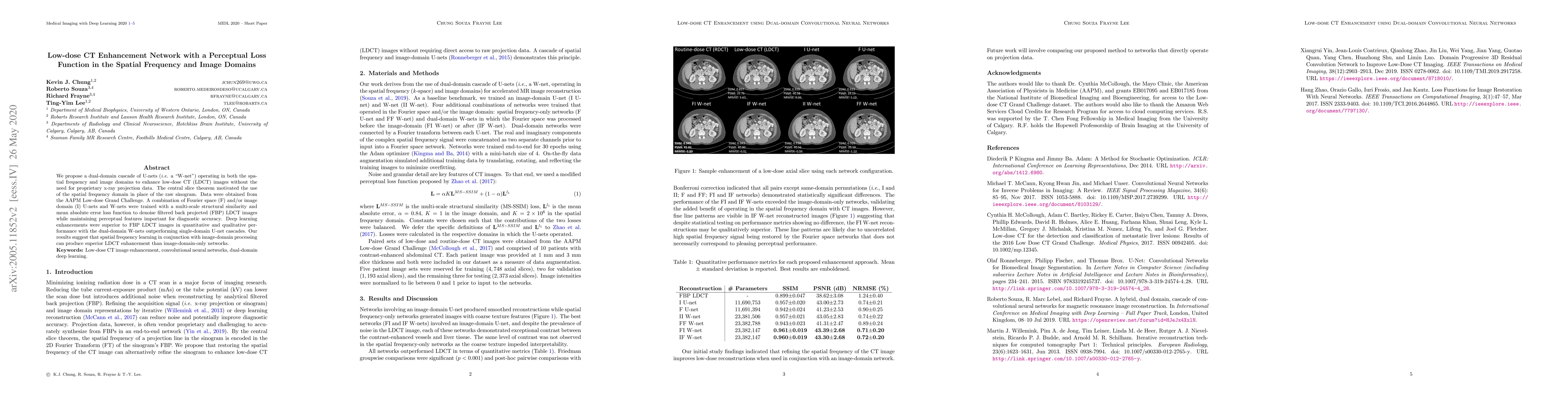This paper proposes a dual-domain cascade of U-nets, termed "W-net," to enhance low-dose CT images using spatial frequency and image domains. The method outperforms single-domain U-nets, achieving superior denoising and maintaining diagnostic features.