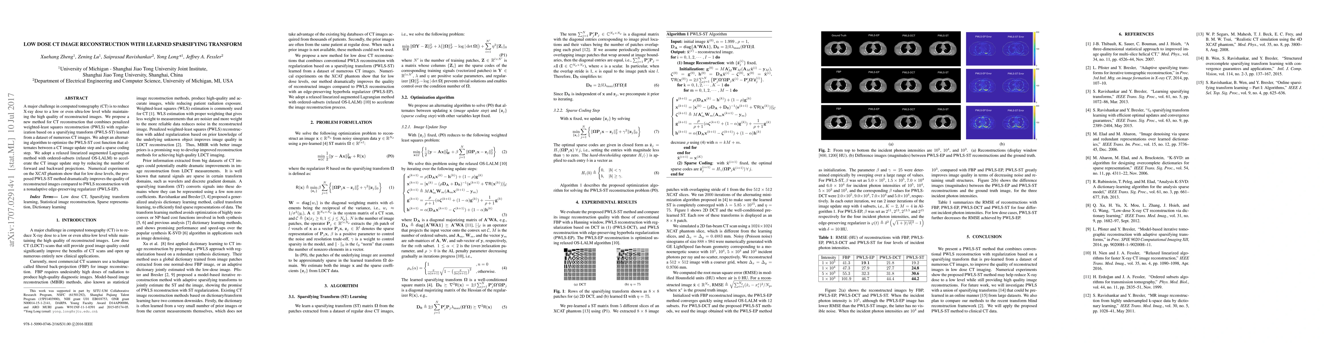 This paper proposes a novel CT reconstruction method combining penalized weighted-least squares reconstruction with a learned sparsifying transform to reduce X-ray dose while maintaining image quality. The method uses an alternating algorithm and a relaxed OS-LALM to optimize the reconstruction, showing significant improvements in image quality at low dose levels compared to traditional methods.
