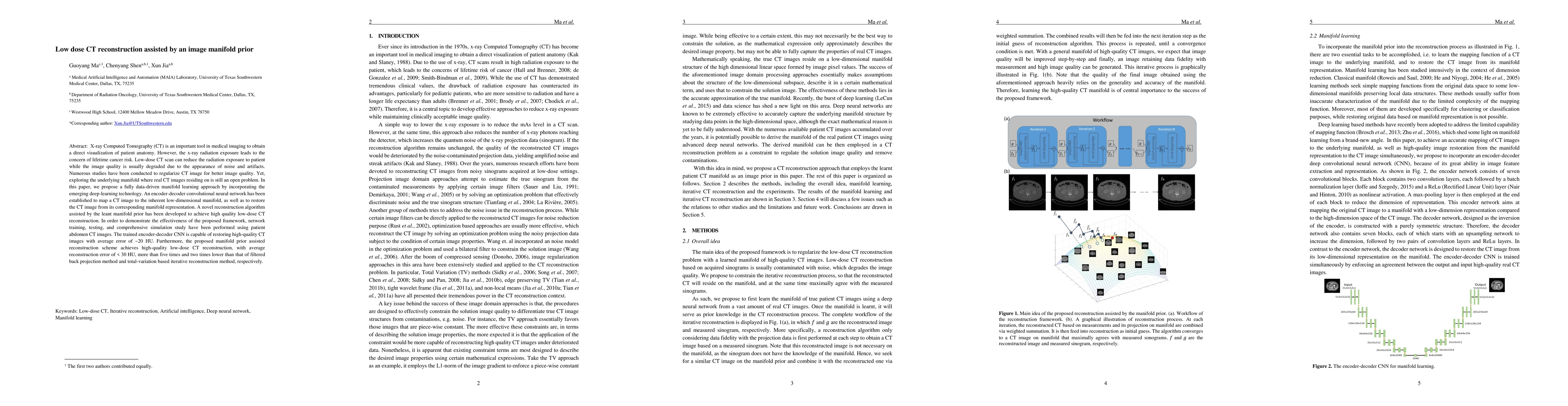 This paper proposes a data-driven manifold learning approach using deep learning to reconstruct high-quality low-dose CT images, significantly reducing radiation exposure. The method employs an encoder-decoder CNN to map CT images to a low-dimensional manifold and restores them, achieving an average reconstruction error of less than 30 HU, outperforming traditional methods.