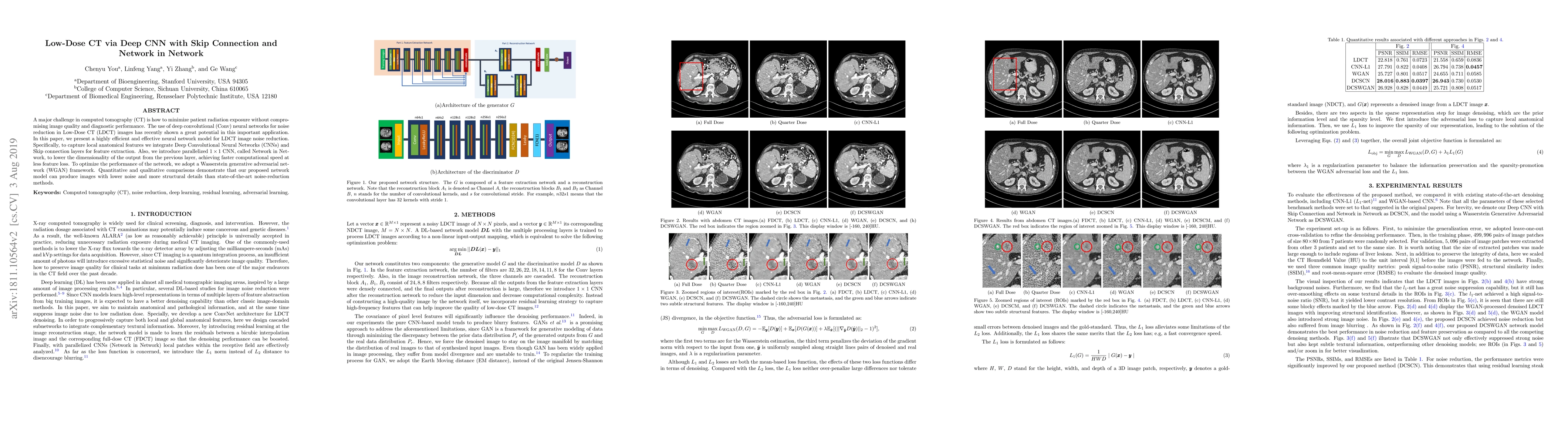 This paper proposes an efficient neural network model combining Deep Convolutional Neural Networks with Skip connections and a Network in Network architecture for reducing noise in Low-Dose CT images, aiming to minimize radiation exposure while maintaining image quality. The model employs a Wasserstein GAN framework to optimize performance, achieving superior results compared to existing methods.