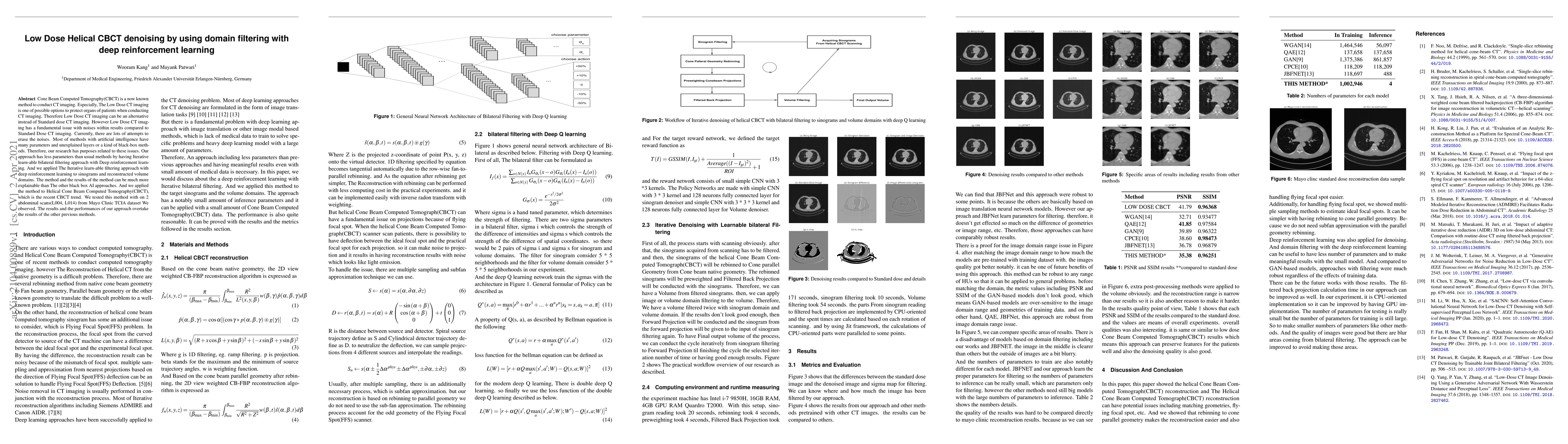 This research proposes a low-dose helical Cone Beam Computed Tomography (CBCT) denoising method using domain filtering with deep reinforcement learning, which features fewer parameters and greater explainability compared to traditional black-box AI approaches. The method outperformed previous techniques in denoising abdominal scans from the Mayo Clinic TCIA dataset.