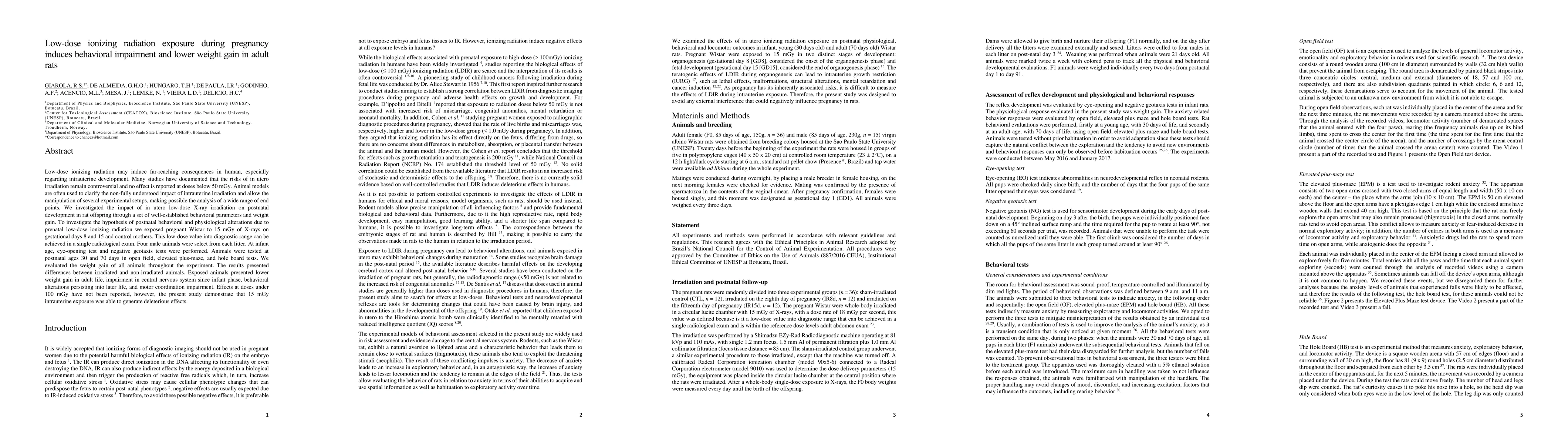 Low-dose ionizing radiation exposure during pregnancy may cause behavioral impairment and lower weight gain in adult rats, with effects persisting into later life at doses below 100 mGy.