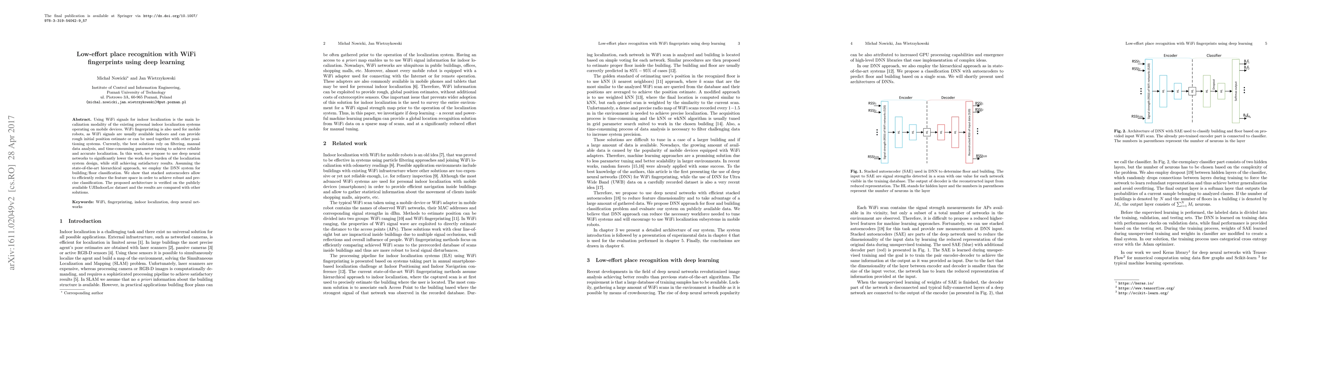 Using WiFi signals for indoor localization is the main localization modality of the existing personal indoor localization systems operating on mobile devices. WiFi fingerprinting is also used for mobile robots, as WiFi signals are usually available indoors and can provide rough initial position estimate or can be used together with other positioning systems. Currently, the best solutions rely on filtering, manual data analysis, and time-consuming parameter tuning to achieve reliable and accurate localization. In this work, we propose to use deep neural networks to significantly lower the work-force burden of the localization system design, while still achieving satisfactory results. Assuming the state-of-the-art hierarchical approach, we employ the DNN system for building/floor classification. We show that stacked autoencoders allow to efficiently reduce the feature space in order to achieve robust and precise classification. The proposed architecture is verified on the publicly available UJIIndoorLoc dataset and the results are compared with other solutions.