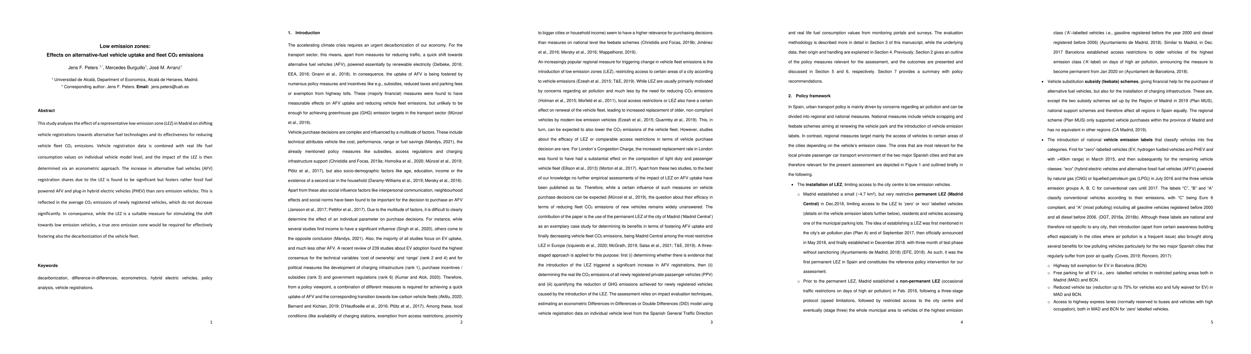 This study analyses the actual effect of a representative low-emission zone (LEZ) in terms of shifting vehicle registrations towards alternative fuel technologies and its effectiveness for reducing vehicle fleet CO2 emissions. Vehicle registration data is combined with real life fuel consumption values on individual vehicle model level, and the impact of the LEZ is then determined via an econometric approach. The increase in alternative fuel vehicles (AFV) registration shares due to the LEZ is found to be significant but fosters rather fossil fuel powered AFV and plug-in hybrid electric vehicles than zero emission vehicles. This is reflected in the average CO2 emissions of newly registered vehicles, which do not decrease significantly. In consequence, while the LEZ is an effective measure for stimulating the shift towards low emission vehicles, the support of non-electric AFV as low emission vehicles jeopardizes its effectiveness for decarbonizing the vehicle fleet.