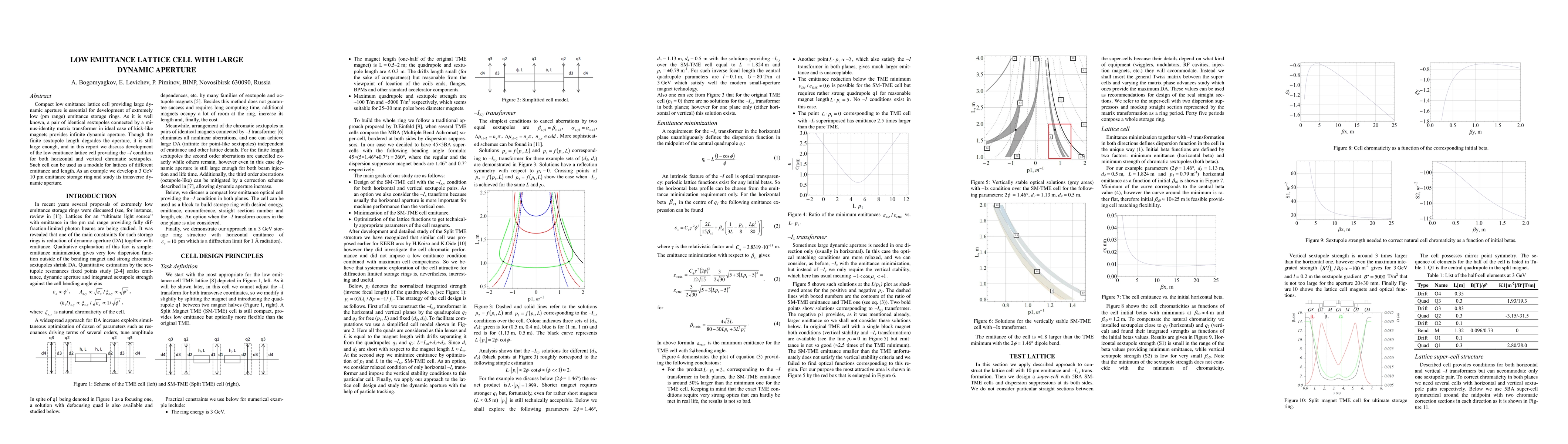 Compact low emittance lattice cell providing large dynamic aperture is essentual for development of extremely low (pm range) emittance storage rings. As it is well known, a pair of identical sextupoles connected by a minus-identy matrix transformer in ideal case of kick-like magnets provides infinite dynamic aperture. Though the finite sextupole length degrades the aperture, it is still large enough, and in this report we discuss development of the low emittance lattice cell providing the -I condition for both horizontal and vertical chromatic sextupoles. Such cell can be used as a module for lattices of different emittance and length. As an example we develop a 3 GeV 10 pm emittance storage ring and study its transverse dynamic aperture.