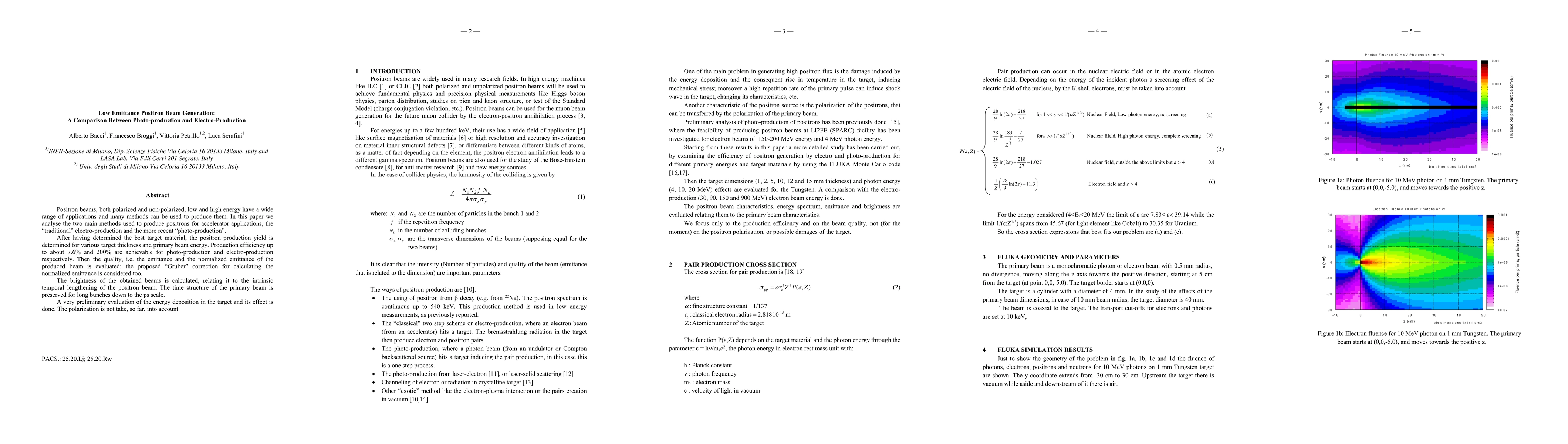 Positron beams, both polarized and non-polarized, low and high energy have a wide range of applications and many methods can be used to produce them. In this paper we analyse the two main methods used to produce positrons for accelerator applications, the "traditional" electro-production and the more recent "photo-production". After having determined the best target material, the positron production yield is determined for various target thickness and primary beam energy. Production efficiency up to about 7.6% and 200% are achievable for photo-production and electro-production respectively. Then the quality, i.e. the emittance and the normalized emittance of the produced beam is evaluated; the proposed "Gruber" correction for calculating the normalized emittance is considered too. The brightness of the obtained beams is calculated, relating it to the intrinsic temporal lengthening of the positron beam. The time structure of the primary beam is preserved for long bunches down to the ps scale. A very preliminary evaluation of the energy deposition in the target and its effect is done. The polarization is not take, so far, into account.