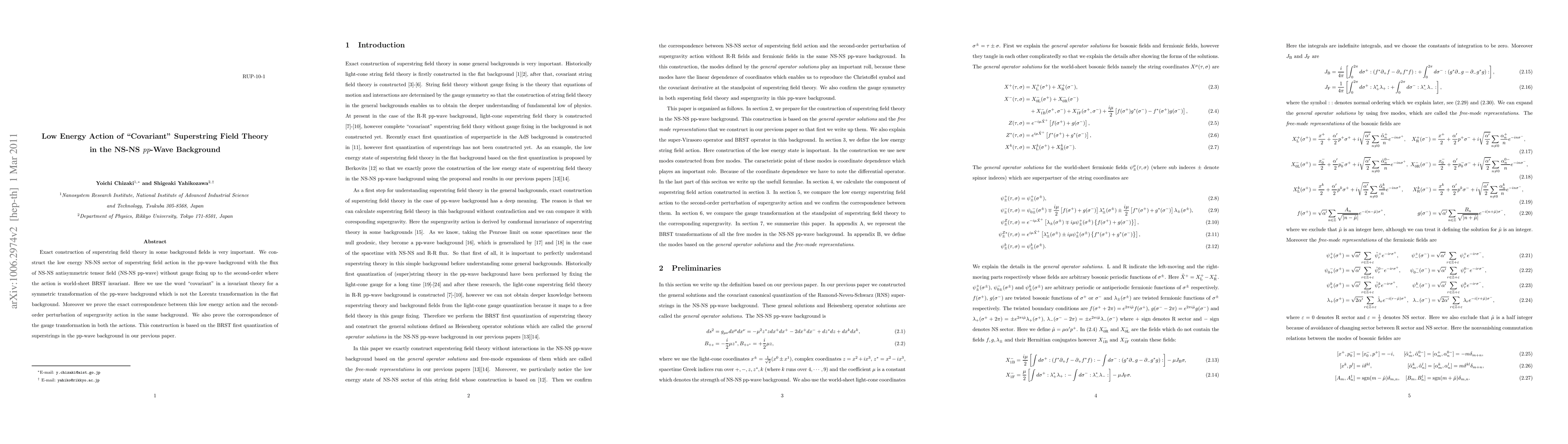 Exact construction of superstring field theory in some background fields is very important. We construct the low energy NS-NS sector of superstring field action in the pp-wave background with the flux of NS-NS antisymmetric tensor field (NS-NS pp-wave) without gauge fixing up to the second-order where the action is world-sheet BRST invariant. Here we use the word "covariant" in a invariant theory for a symmetric transformation of the pp-wave background which is not the Lorentz transformation in the flat background. Moreover we prove the exact correspondence between this low energy action and the second-order perturbation of supergravity action in the same background. We also prove the correspondence of the gauge transformation in both the actions. This construction is based on the BRST first quantization of superstrings in the pp-wave background in our previous paper.