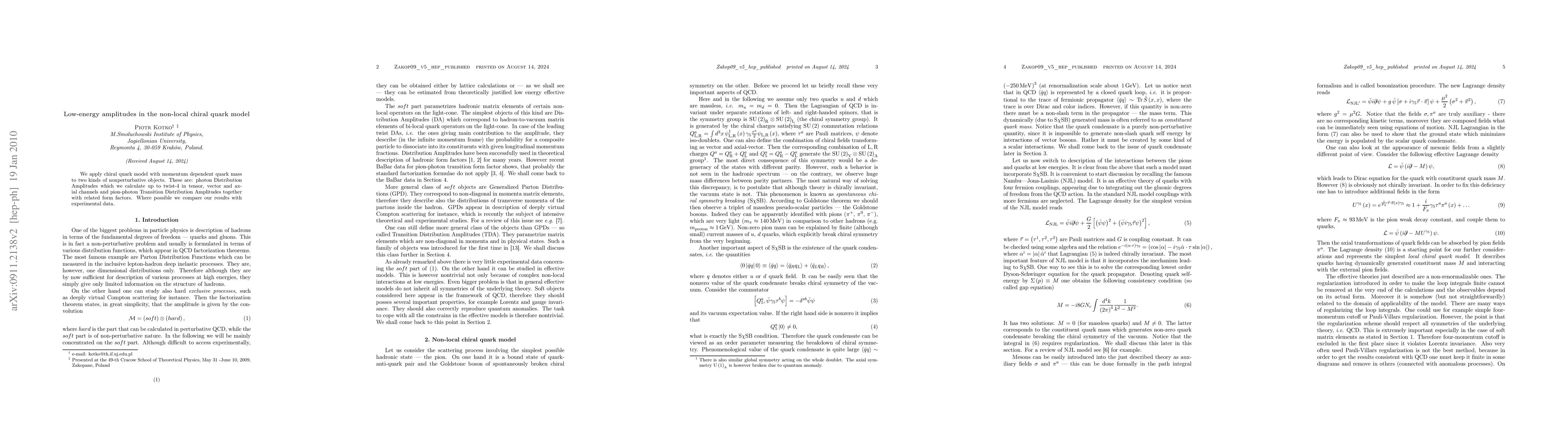 We apply chiral quark model with momentum dependent quark mass to two kinds of non-perturbative objects. These are: photon Distribution Amplitudes which we calculate up to twist-4 in tensor, vector and axial channels and pion-photon Transition Distribution Amplitudes together with related form factors. Where possible we compare our results with experimental data.