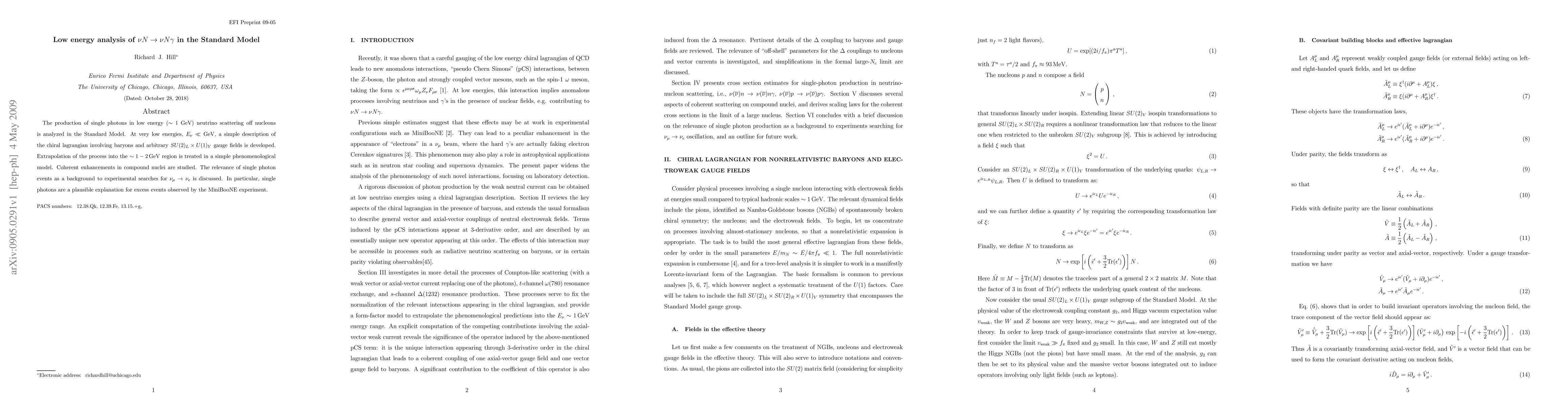This paper analyzes low-energy neutrino-nucleon scattering producing single photons within the Standard Model, developing a chiral lagrangian for very low energies and a phenomenological model for the 1-2 GeV region. It also investigates coherent enhancements in compound nuclei and discusses single photon events as a background for nu_mu to nu_e searches, suggesting they could explain excess events observed by MiniBooNE.