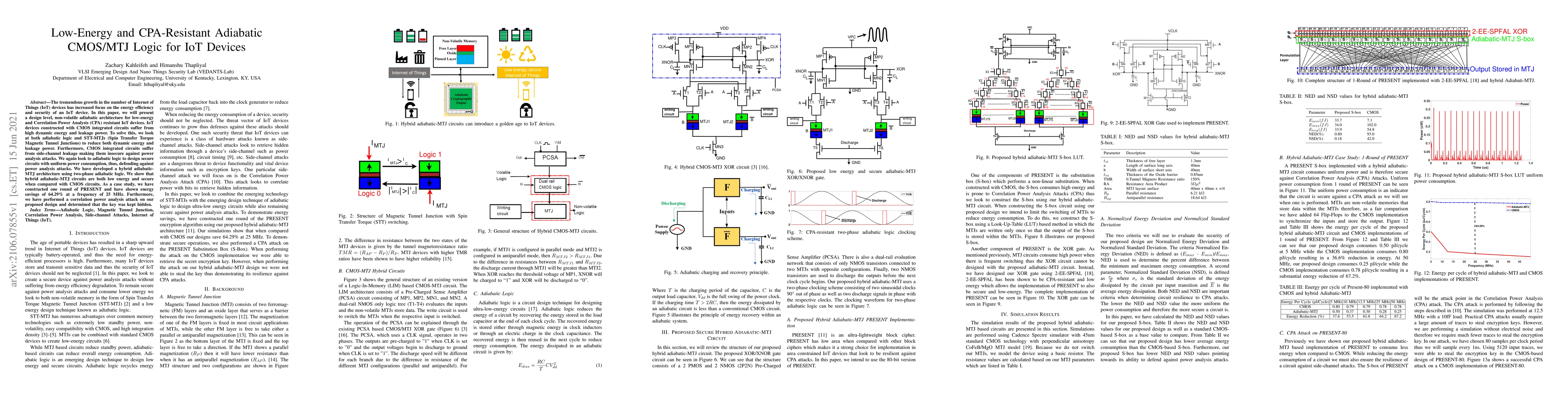 The tremendous growth in the number of Internet of Things (IoT) devices has increased focus on the energy efficiency and security of an IoT device. In this paper, we will present a design level, non-volatile adiabatic architecture for low-energy and Correlation Power Analysis (CPA) resistant IoT devices. IoT devices constructed with CMOS integrated circuits suffer from high dynamic energy and leakage power. To solve this, we look at both adiabatic logic and STT-MTJs (Spin Transfer Torque Magnetic Tunnel Junctions) to reduce both dynamic energy and leakage power. Furthermore, CMOS integrated circuits suffer from side-channel leakage making them insecure against power analysis attacks. We again look to adiabatic logic to design secure circuits with uniform power consumption, thus, defending against power analysis attacks. We have developed a hybrid adiabatic- MTJ architecture using two-phase adiabatic logic. We show that hybrid adiabatic-MTJ circuits are both low energy and secure when compared with CMOS circuits. As a case study, we have constructed one round of PRESENT and have shown energy savings of 64.29% at a frequency of 25 MHz. Furthermore, we have performed a correlation power analysis attack on our proposed design and determined that the key was kept hidden.