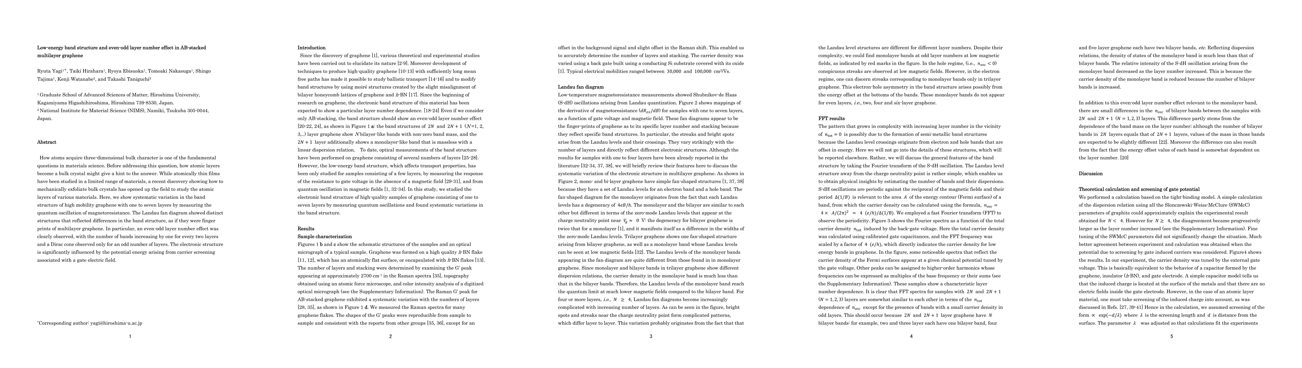 This paper investigates the low-energy band structure of AB-stacked multilayer graphene, revealing systematic variations in band structure with layer number. An even-odd layer number effect is observed, with an additional band for every two layers and a Dirac cone present only in odd-numbered layers, influenced by gate electric field effects.
