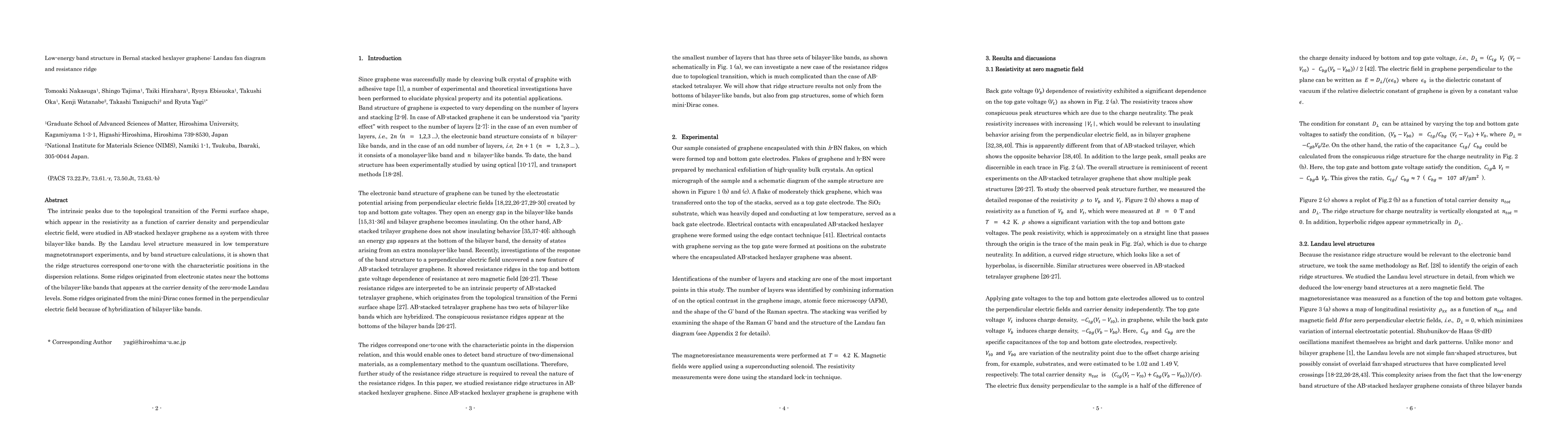 This study investigates the low-energy band structure of Bernal-stacked hexlayer graphene using transport properties, revealing three overlapping bilayer-like bands forming a semimetal. The Landau fan diagram shows splitting of zero-mode Landau levels and a ridge-like resistivity structure at zero magnetic field, originating from the band structure and local energy gap structures.