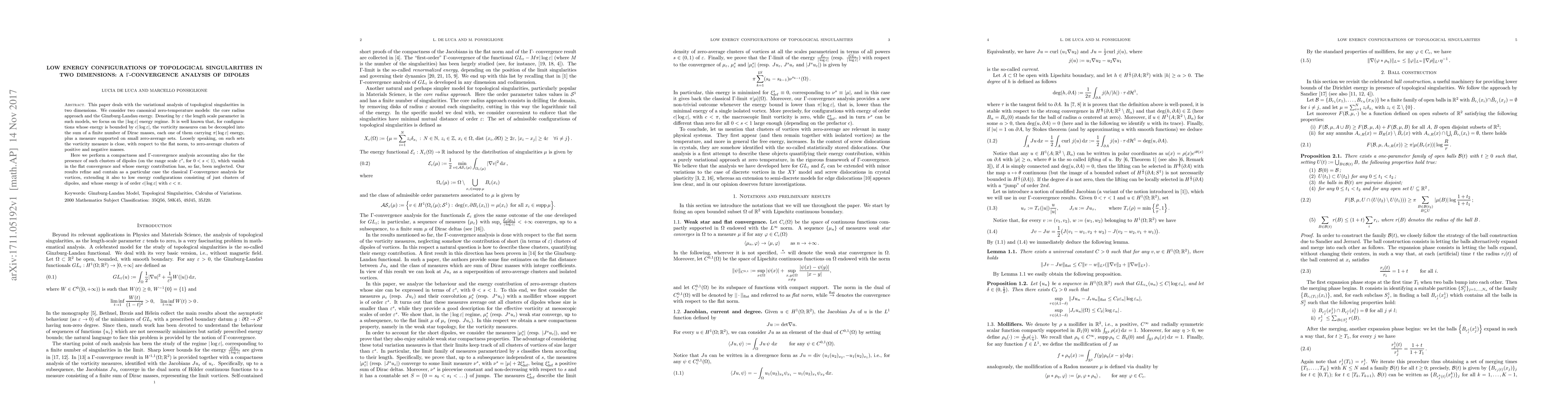 Researchers analyzed low-energy configurations of topological singularities in 2D, focusing on clusters of dipoles that were previously neglected in similar studies, revealing new insights into the behavior of vorticity measures.