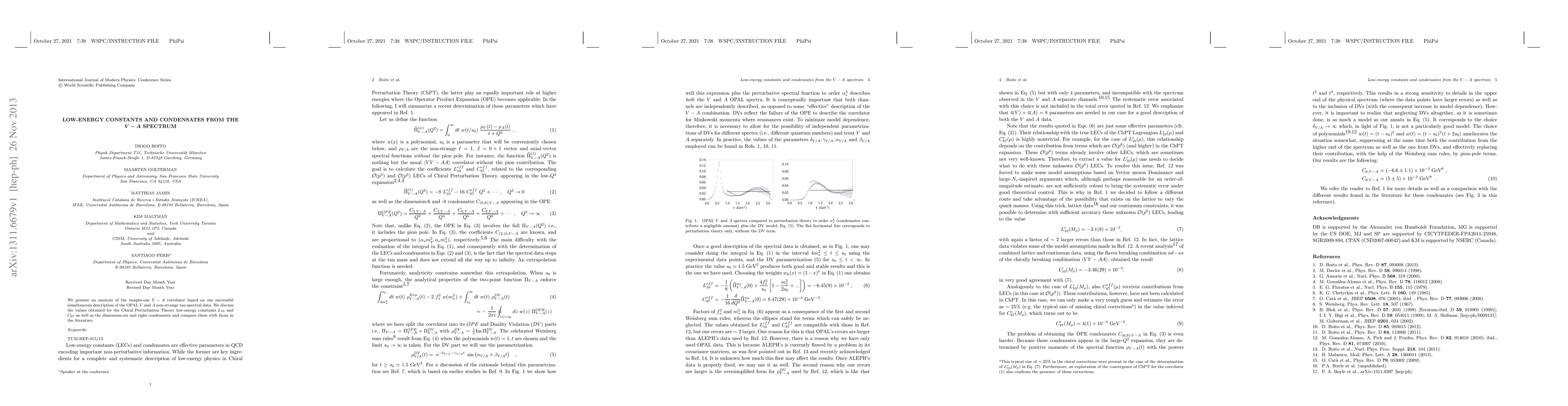This study analyzes the isospin-one V-A correlator using OPAL V and A non-strange tau spectral data, determining values for Chiral Perturbation Theory low-energy constants L_10 and C_87, as well as dimension-six and eight condensates, and comparing them with existing literature values.