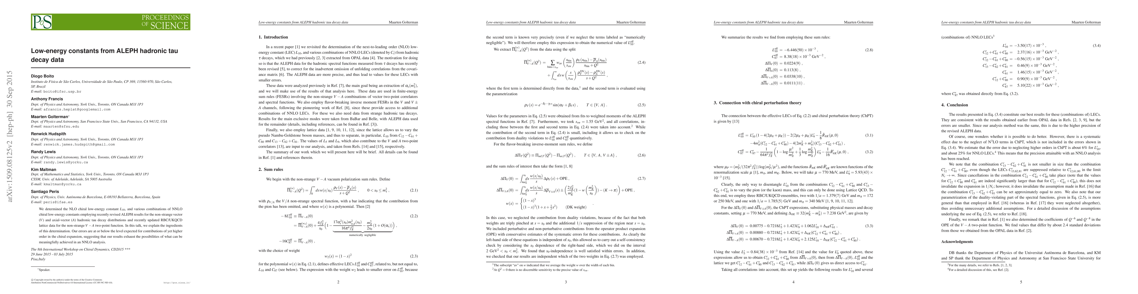 We determined the NLO chiral low-energy constant $L_{10}$, and various combinations of NNLO chiral low-energy constants employing recently revised ALEPH results for the non-strange vector (V) and axial-vector (A) hadronic tau decay distributions and recently updated RBC/UKQCD lattice data for the non-strange V-A two-point function. In this talk, we explain the ingredients of this determination. Our errors are at or below the level expected for contributions of yet higher order in the chiral expansion, suggesting that our results exhaust the possibilities of what can be meaningfully achieved in an NNLO analysis.