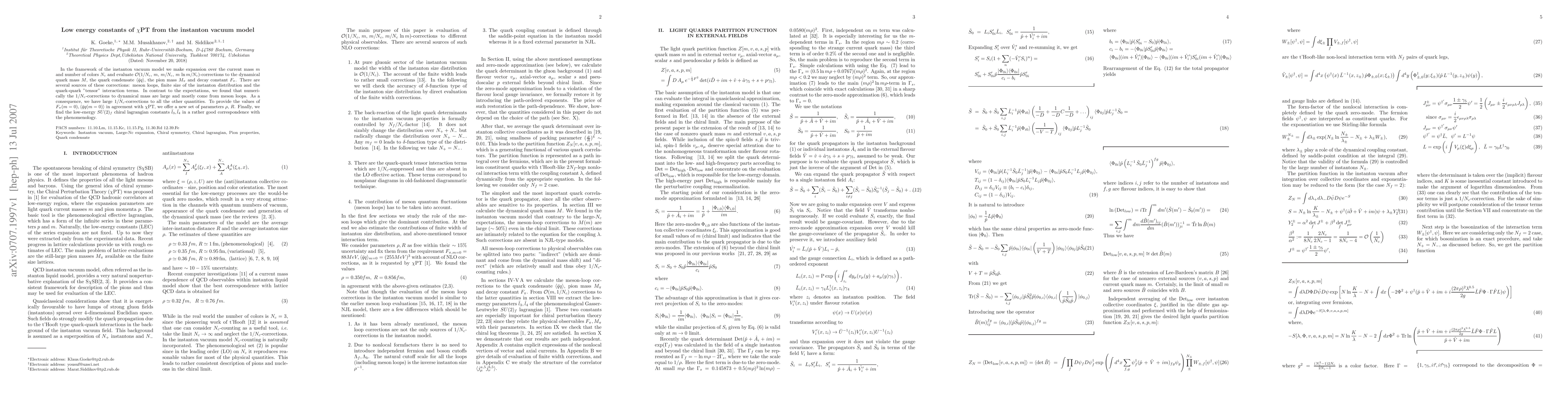 This paper evaluates low-energy corrections in the instanton vacuum model for chiral perturbation theory (χPT), finding significant 1/N_c corrections to dynamical quark mass and other quantities, primarily from meson loops. It proposes new parameters to align theoretical results with χPT and determines chiral Lagrangian constants that match phenomenological data.