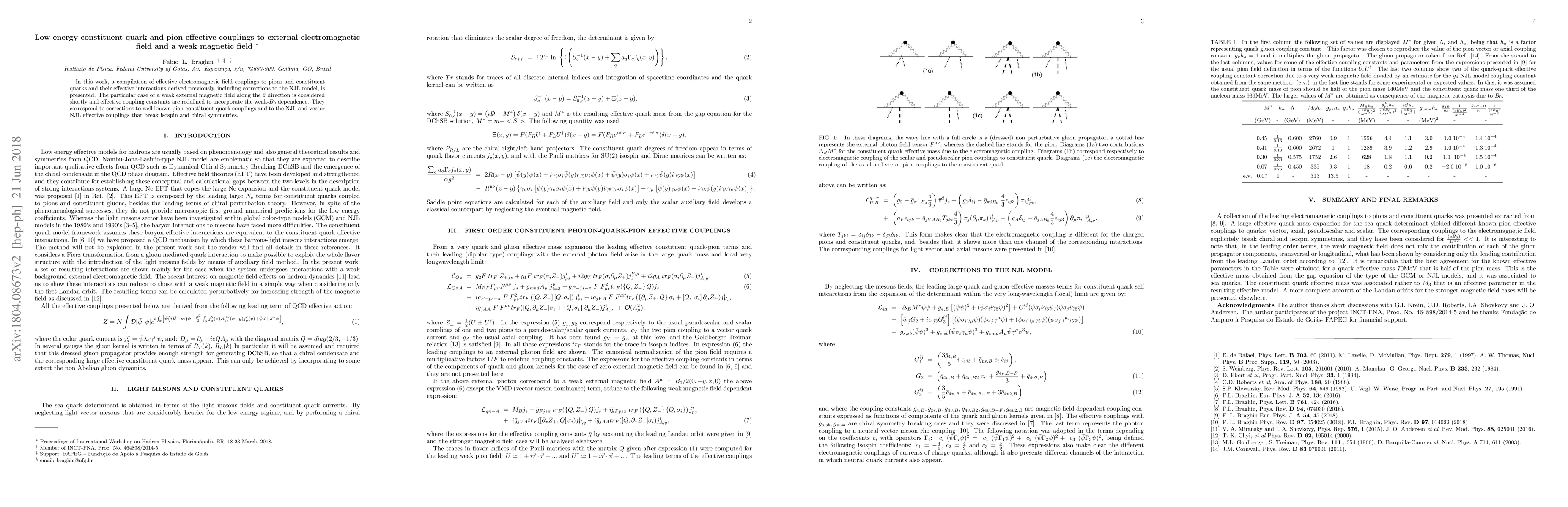 This paper compiles effective electromagnetic couplings for pions and constituent quarks, including corrections to the NJL model. It also examines the weak magnetic field's influence on these couplings, redefining constants to account for the weak-$B_0$ dependence, thus correcting known pion-quark interactions and NJL effective couplings.