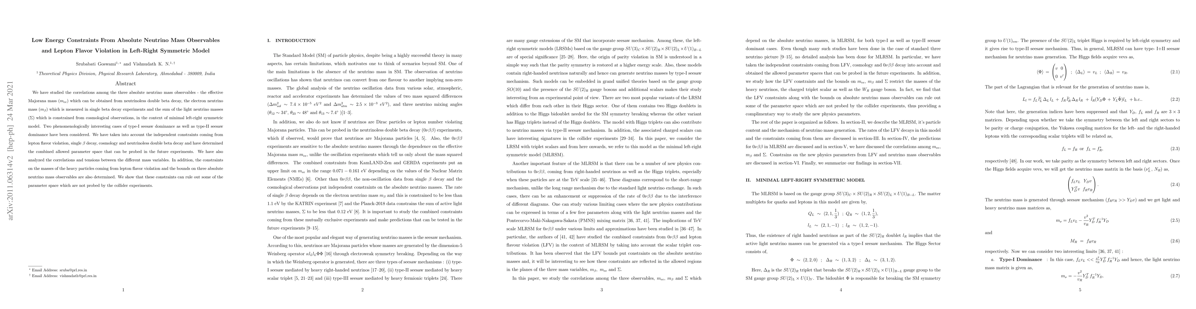 This paper explores correlations among three absolute neutrino mass observables within a minimal left-right symmetric model, considering type-I and type-II seesaw dominance. It determines the allowed parameter space influenced by lepton flavor violation, beta decay, cosmology, and neutrinoless double beta decay, revealing constraints that can rule out unprobed parameter spaces.