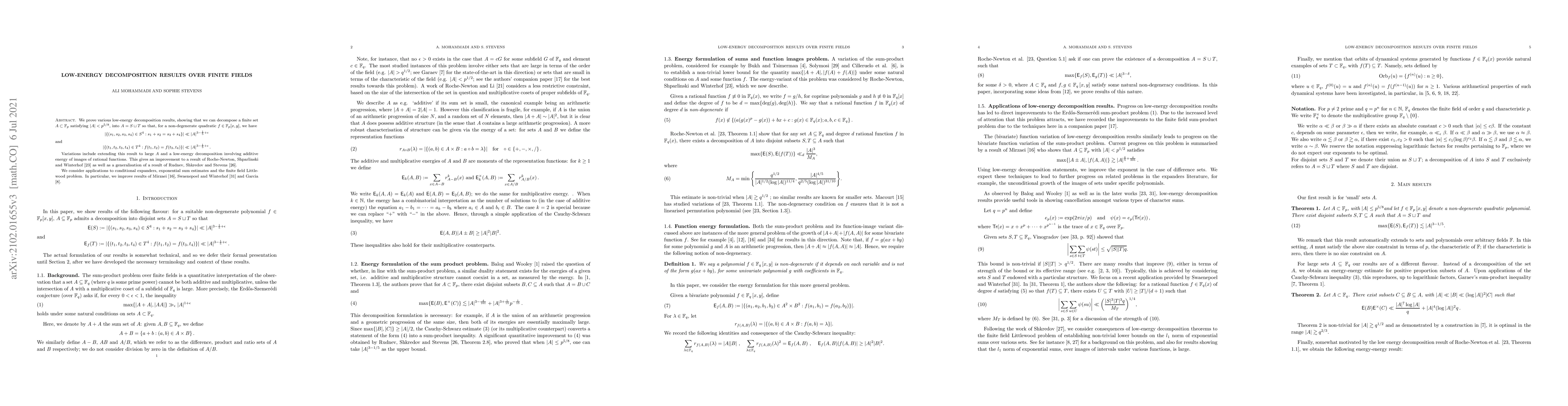 This research paper proves low-energy decomposition results over finite fields, showing that a set of size less than $p^{5/8}$ can be decomposed into two sets with specific properties, improving previous results in certain applications.