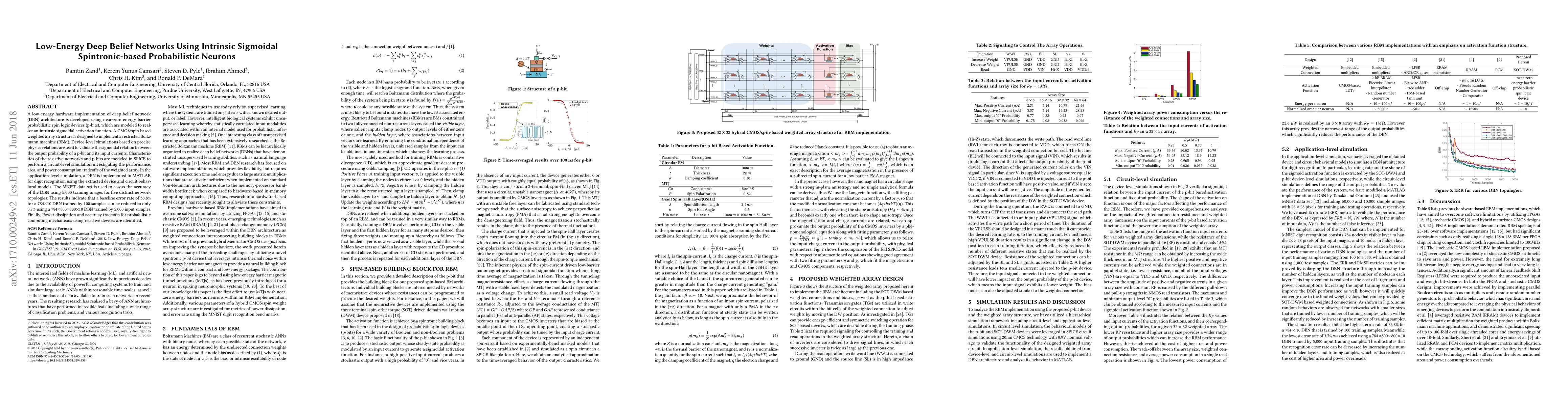 A low-energy hardware implementation of deep belief network (DBN) architecture is developed using near-zero energy barrier probabilistic spin logic devices (p-bits), which are modeled to realize an intrinsic sigmoidal activation function. A CMOS/spin based weighted array structure is designed to implement a restricted Boltzmann machine (RBM). Device-level simulations based on precise physics relations are used to validate the sigmoidal relation between the output probability of a p-bit and its input currents. Characteristics of the resistive networks and p-bits are modeled in SPICE to perform a circuit-level simulation investigating the performance, area, and power consumption tradeoffs of the weighted array. In the application-level simulation, a DBN is implemented in MATLAB for digit recognition using the extracted device and circuit behavioral models. The MNIST data set is used to assess the accuracy of the DBN using 5,000 training images for five distinct network topologies. The results indicate that a baseline error rate of 36.8% for a 784x10 DBN trained by 100 samples can be reduced to only 3.7% using a 784x800x800x10 DBN trained by 5,000 input samples. Finally, Power dissipation and accuracy tradeoffs for probabilistic computing mechanisms using resistive devices are identified.