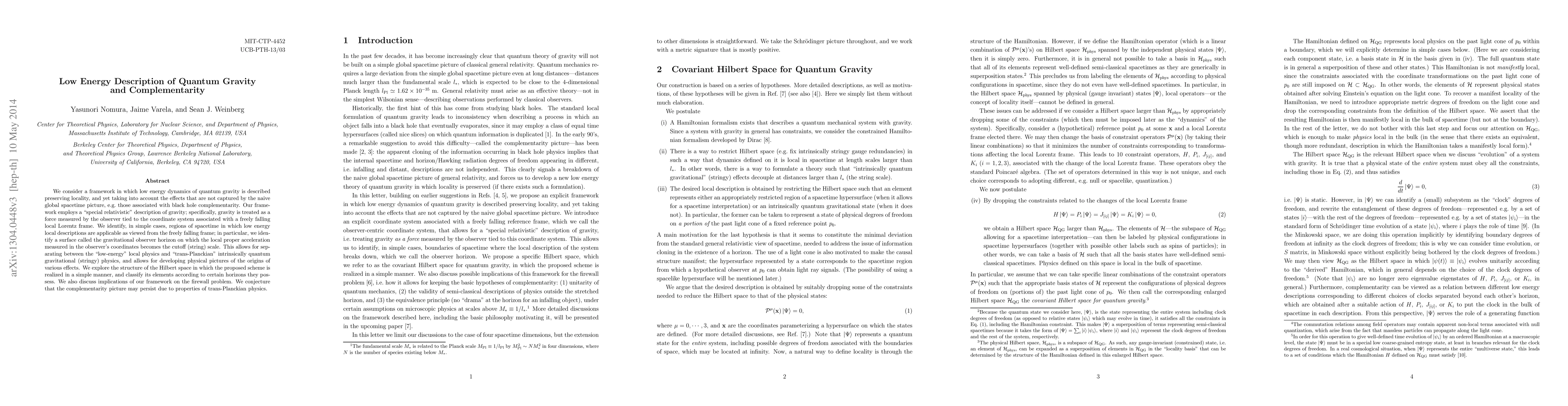 This research paper proposes a new framework for understanding quantum gravity, dividing physics into low-energy local descriptions and trans-Planckian, quantum-gravitational effects. It aims to resolve the firewall problem by preserving locality while accounting for black hole complementarity.