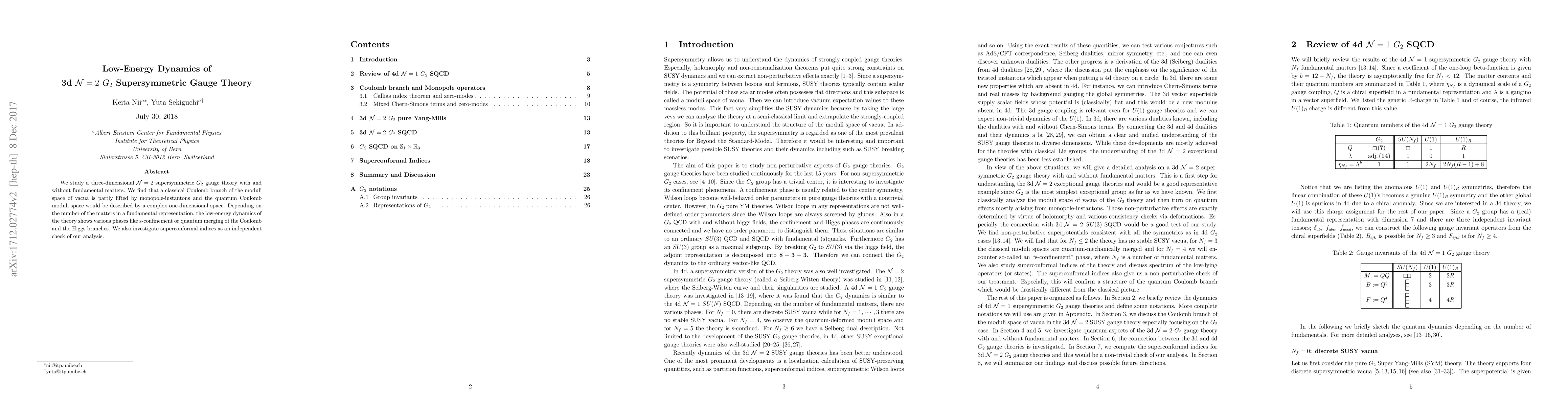 We study a three-dimensional $\mathcal{N}=2$ supersymmetric $G_2$ gauge theory with and without fundamental matters. We find that a classical Coulomb branch of the moduli space of vacua is partly lifted by monopole-instantons and the quantum Coulomb moduli space would be described by a complex one-dimensional space. Depending on the number of the matters in a fundamental representation, the low-energy dynamics of the theory shows various phases like s-confinement or quantum merging of the Coulomb and the Higgs branches. We also investigate superconformal indices as an independent check of our analysis.