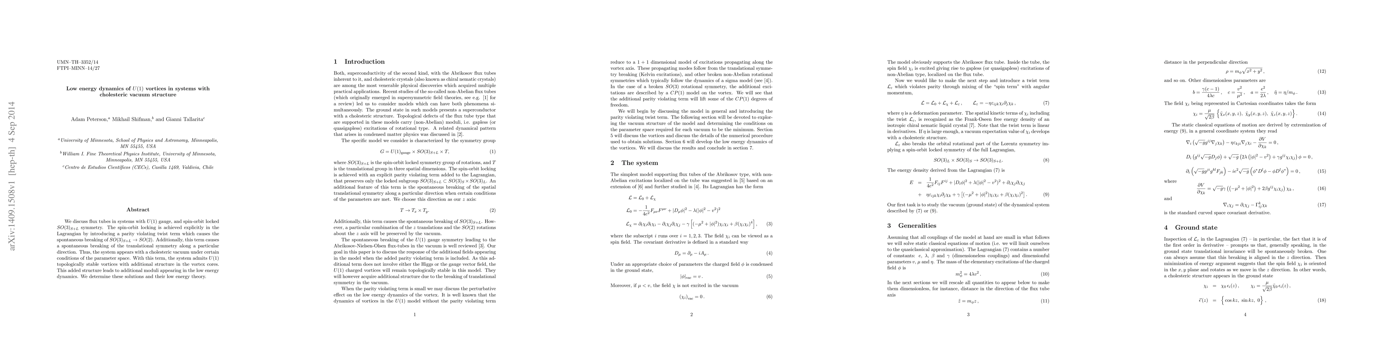 We discuss flux tubes in systems with $U(1)$ gauge, and spin-orbit locked $SO(3)_{S+L}$ symmetry. The spin-orbit locking is achieved explicitly in the Lagrangian by introducing a parity violating twist term which causes the spontaneous breaking of $SO(3)_{S+L} \rightarrow SO(2)$. Additionally, this term causes a spontaneous breaking of the translational symmetry along a particular direction. Thus, the system appears with a cholesteric vacuum under certain conditions of the parameter space. With this term, the system admits $U(1)$ topologically stable vortices with additional structure in the vortex cores. This added structure leads to additional moduli appearing in the low energy dynamics. We determine these solutions and their low energy theory.