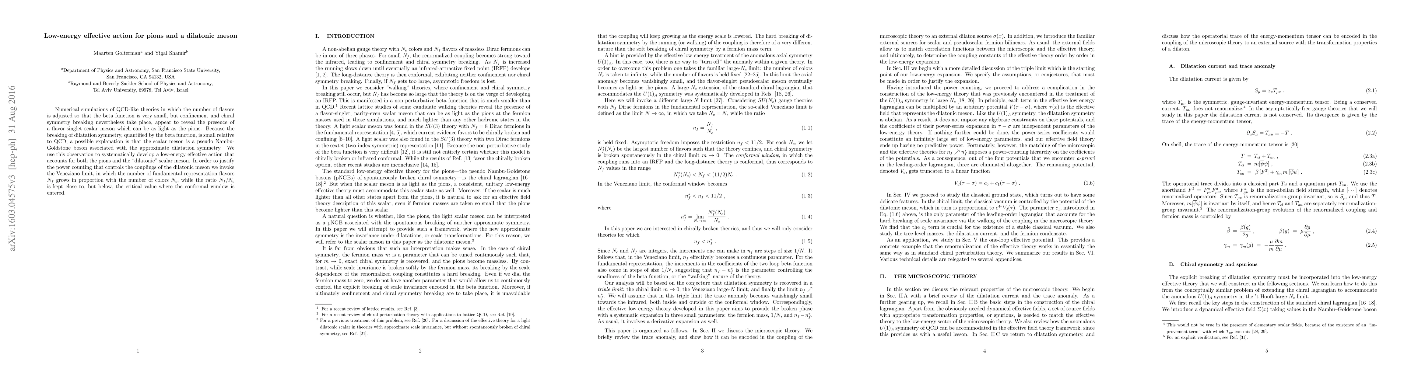 This paper develops a low-energy effective action for pions and a dilatonic meson in QCD-like theories with small beta functions, suggesting the dilatonic meson is a pseudo Nambu-Goldstone boson linked to approximate dilatation symmetry. The Veneziano limit is used to justify the power counting for the dilatonic meson's couplings.