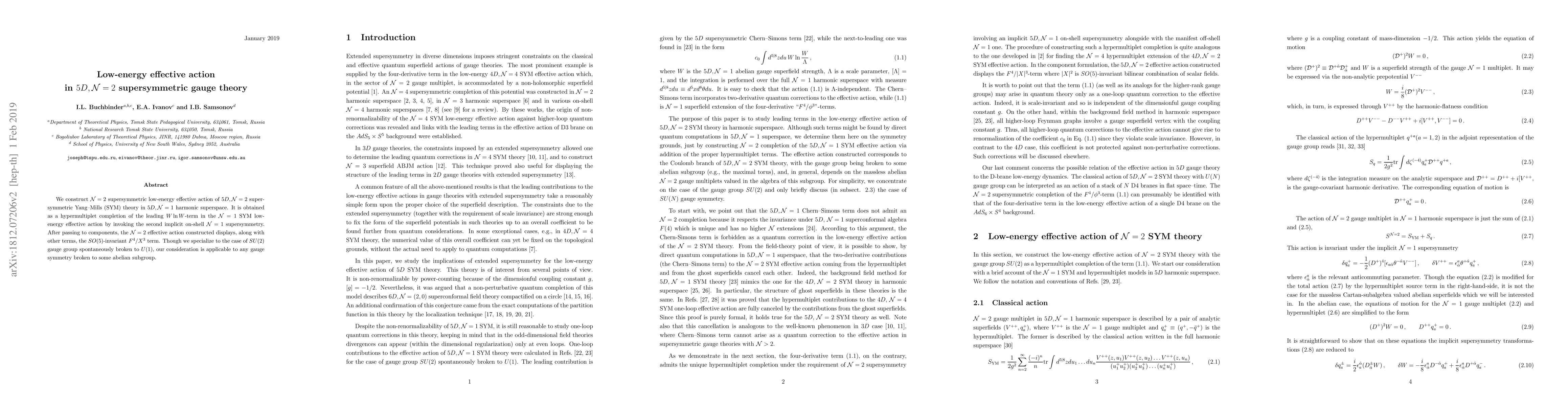 This paper constructs the ${\cal N}=2$ supersymmetric low-energy effective action for $5D$ ${\cal N}=2$ supersymmetric Yang-Mills theory using ${\cal N}=1$ harmonic superspace. The effective action includes an $SO(5)$-invariant $F^4/X^3$ term and applies to gauge symmetry breaking to abelian subgroups, exemplified with $SU(2)$ broken to $U(1)$.