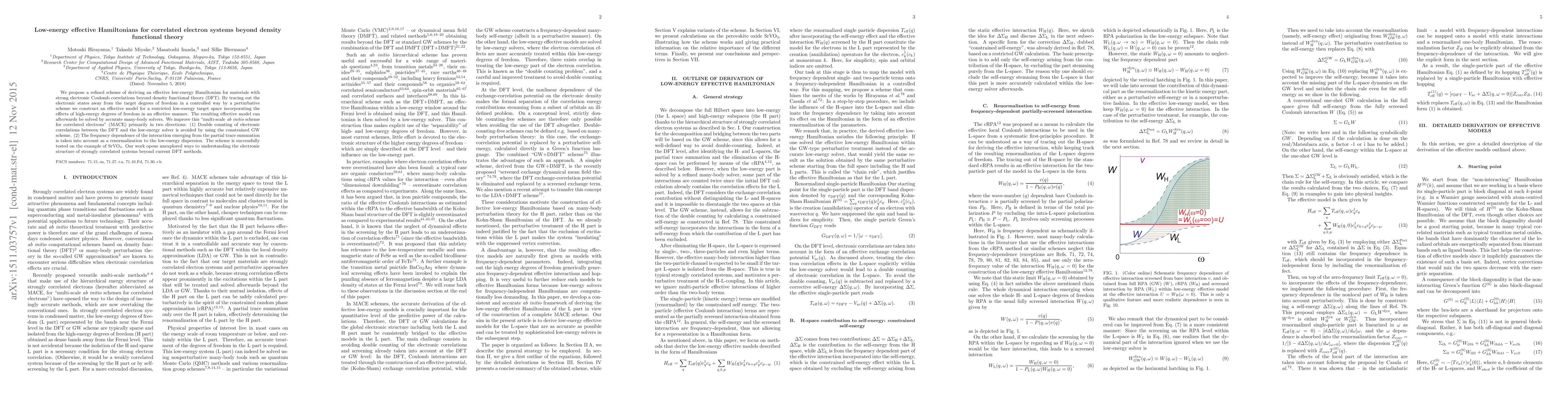 We propose a refined scheme of deriving an effective low-energy Hamiltonian for materials with strong electronic Coulomb correlations beyond density functional theory (DFT). By tracing out the electronic states away from the target degrees of freedom in a controlled way by a perturbative scheme we construct an effective model for a restricted low-energy target space incorporating the effects of high-energy degrees of freedom in an effective manner. The resulting effective model can afterwards be solved by accurate many-body solvers. We improve this "multi-scale ab initio scheme for correlated electrons" (MACE) primarily in two directions: (1) Double counting of electronic correlations between the DFT and the low-energy solver is avoided by using the constrained GW scheme. (2) The frequency dependence of the interaction emerging from the partial trace summation is taken into account as a renormalization to the low-energy dispersion. The scheme is successfully tested on the example of SrVO3. Our work opens unexplored ways to understanding the electronic structure of strongly correlated systems beyond current DFT methods.