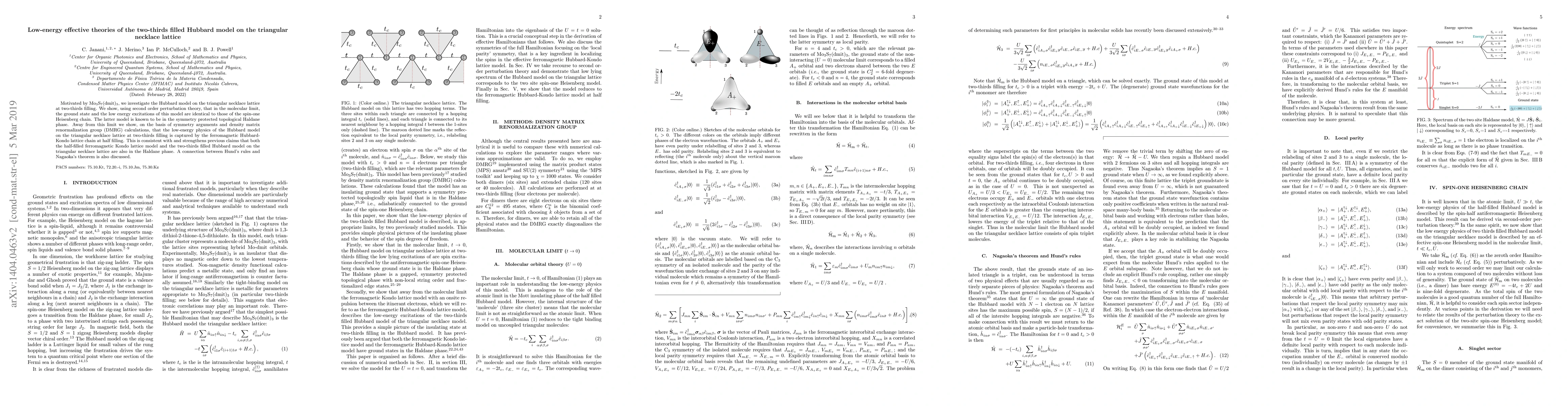 This paper investigates the low-energy effective theories of the two-thirds filled Hubbard model on the triangular necklace lattice, showing it shares ground state and excitations with the spin-one Heisenberg chain in the molecular limit. Away from this limit, it is analogous to the ferromagnetic Hubbard-Kondo lattice chain, supporting the Haldane phase for both models.