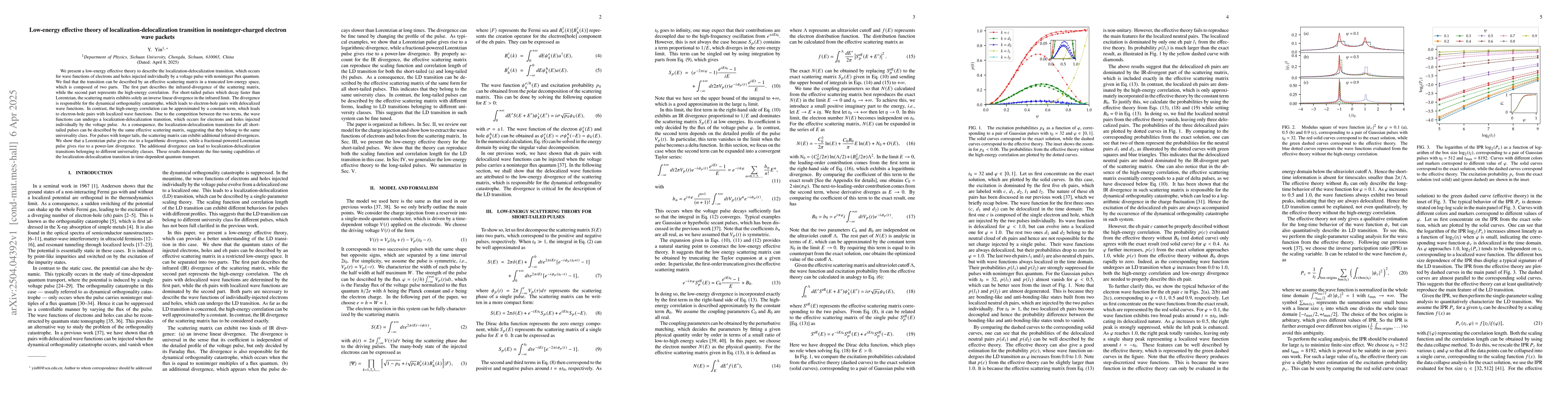 The research presents a low-energy effective theory using a scattering matrix in a truncated low-energy space to describe the localization-delocalization transition for noninteger-charged electron wave packets injected by a voltage pulse.