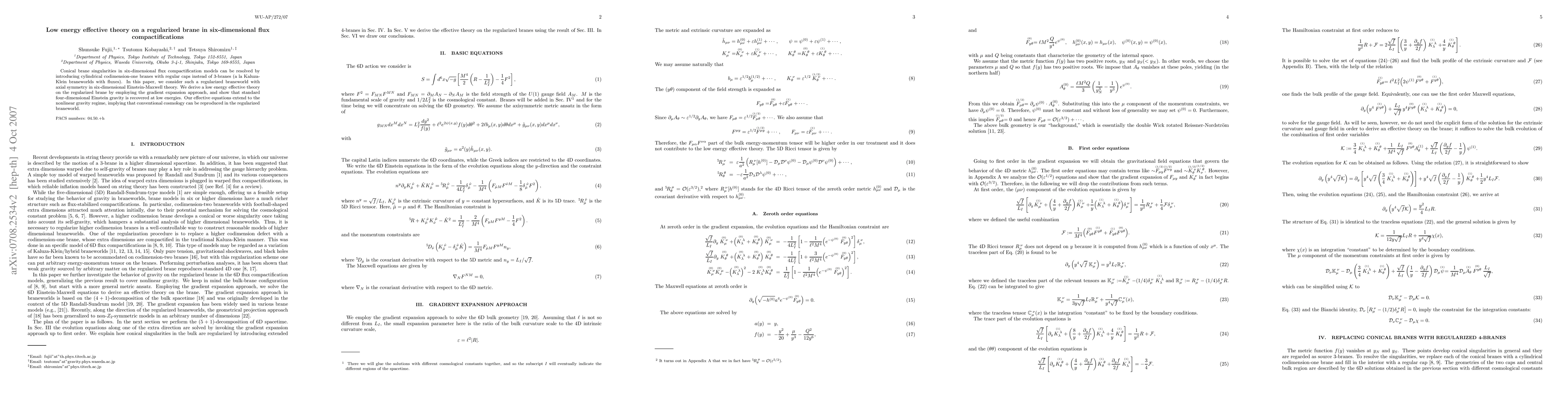 This paper resolves conical singularities in six-dimensional flux compactification models using cylindrical codimension-one branes with regular caps, deriving a low energy effective theory that recovers standard four-dimensional Einstein gravity and extends to nonlinear gravity, allowing for conventional cosmology on the regularized brane.