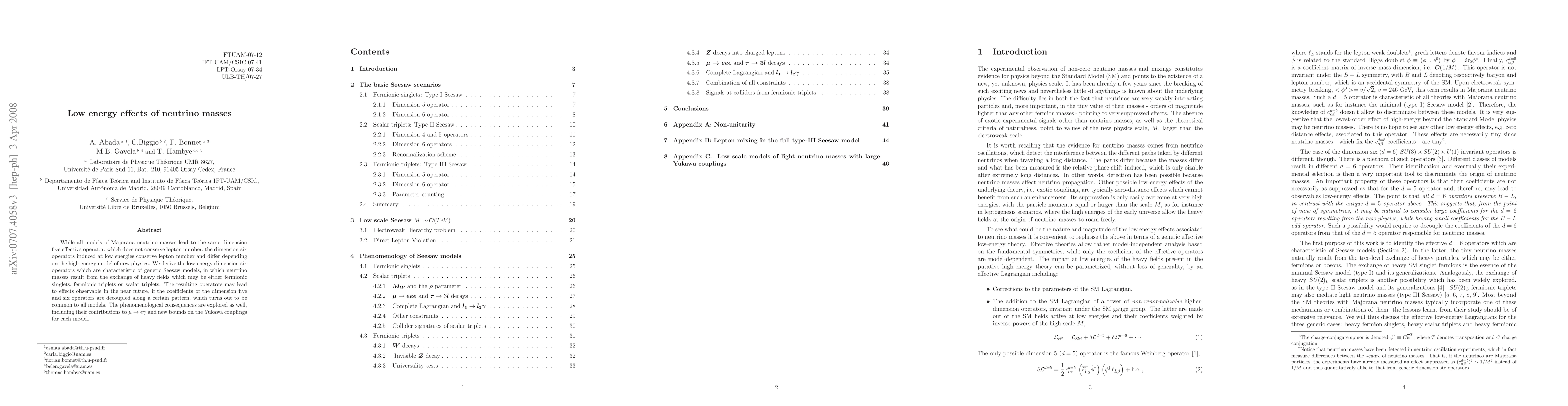 While all models of Majorana neutrino masses lead to the same dimension five effective operator, which does not conserve lepton number, the dimension six operators induced at low energies conserve lepton number and differ depending on the high energy model of new physics. We derive the low-energy dimension six operators which are characteristic of generic Seesaw models, in which neutrino masses result from the exchange of heavy fields which may be either fermionic singlets, fermionic triplets or scalar triplets. The resulting operators may lead to effects observable in the near future, if the coefficients of the dimension five and six operators are decoupled along a certain pattern, which turns out to be common to all models. The phenomenological consequences are explored as well, including their contributions to $\mu \to e \gamma$ and new bounds on the Yukawa couplings for each model.