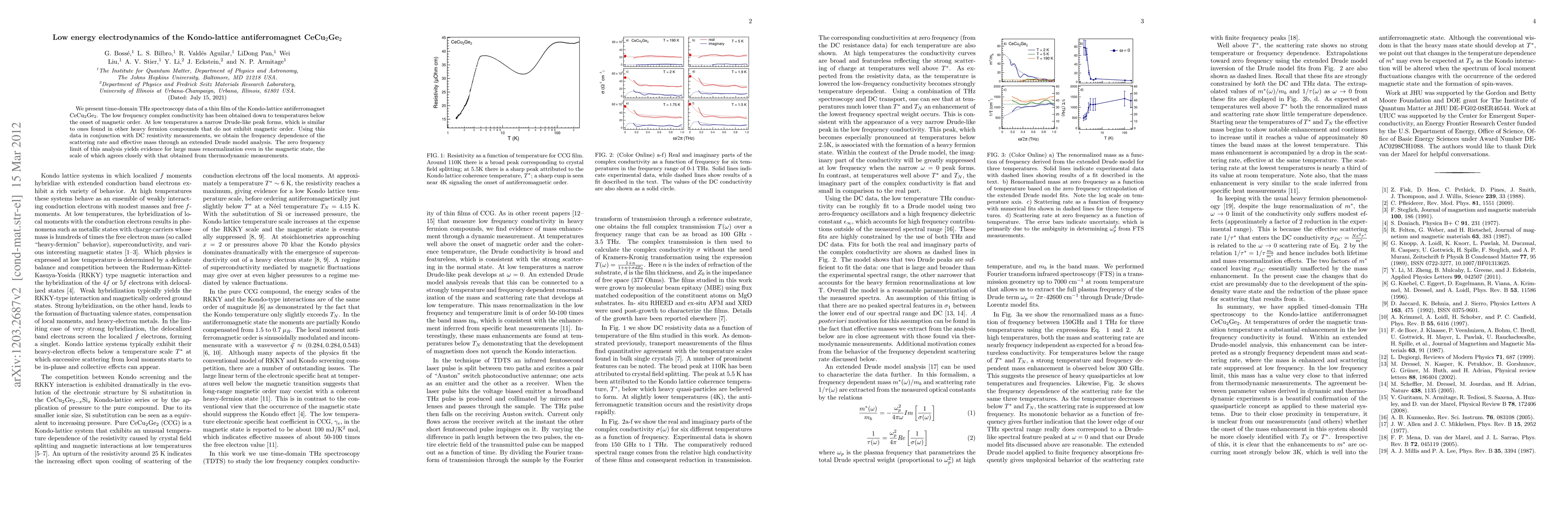 We present time-domain THz spectroscopy data of a thin film of the Kondo-lattice antiferromagnet CeCu$_2$Ge$_2$. The low frequency complex conductivity has been obtained down to temperatures below the onset of magnetic order. At low temperatures a narrow Drude-like peak forms, which is similar to ones found in other heavy fermion compounds that do not exhibit magnetic order. Using this data in conjunction with DC resistivity measurements, we obtain the frequency dependence of the scattering rate and effective mass through an extended Drude model analysis. The zero frequency limit of this analysis yields evidence for large mass renormalization even in the magnetic state, the scale of which agrees closely with that obtained from thermodynamic measurements.