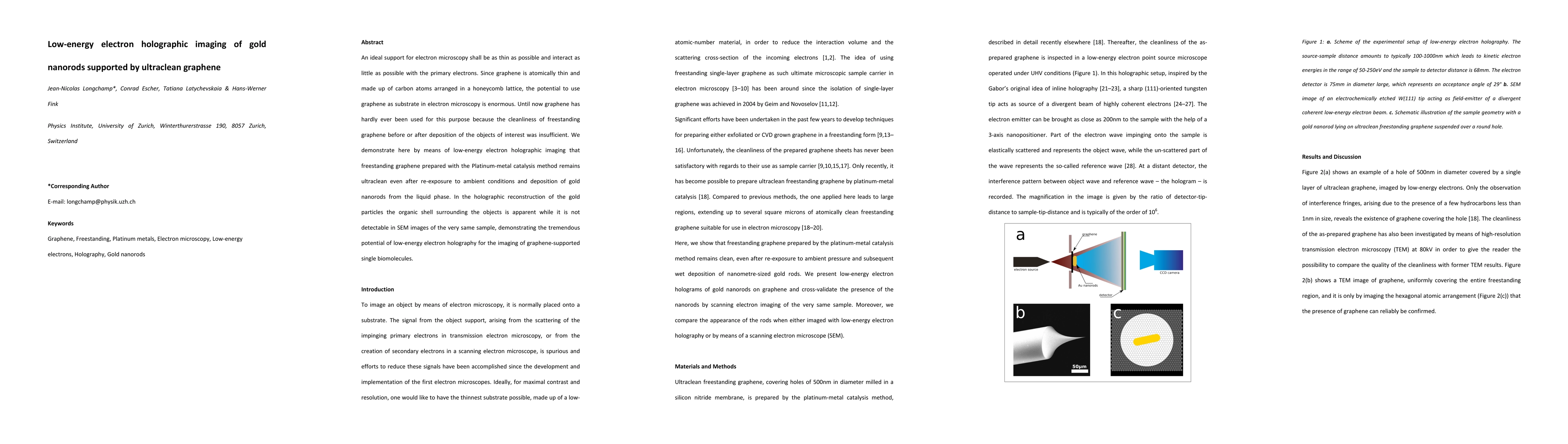 This study demonstrates the use of ultraclean graphene, prepared via Platinum-metal catalysis, as a substrate for electron microscopy, showing it remains pristine after exposure to ambient conditions and gold nanorod deposition. Low-energy electron holographic imaging reveals the organic shell around gold nanorods, which is not visible in SEM, highlighting the potential of this technique for imaging graphene-supported biomolecules.