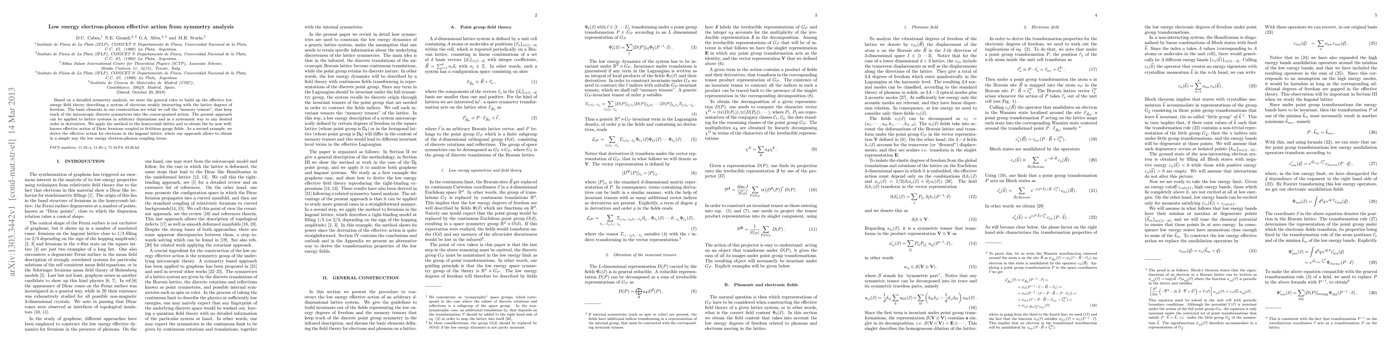 Based on a detailed symmetry analysis, we state the general rules to build up the effective low energy field theory describing a system of electrons weakly interacting with the lattice degrees of freedom. The basic elements in our construction are what we call the "memory tensors", that keep track of the microscopic discrete symmetries into the coarse-grained action. The present approach can be applied to lattice systems in arbitrary dimensions and in a systematic way to any desired order in derivatives. We apply the method to the honeycomb lattice and re-obtain the by now well-known effective action of Dirac fermions coupled to fictitious gauge fields. As a second example, we derive the effective action for electrons in the kagom\'e lattice, where our approach allows to obtain in a simple way the low energy electron-phonon coupling terms.