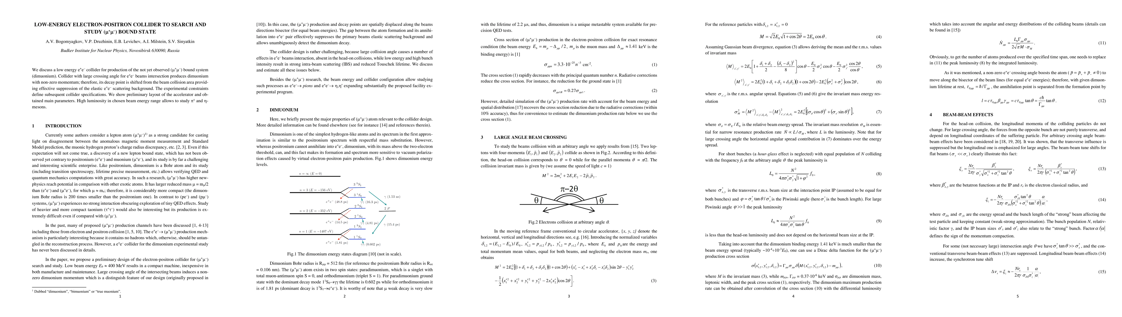 We discuss a low energy $e^+e^-$ collider for production of the not yet observed ($\mu^+\mu^-$) bound system (dimuonium). Collider with large crossing angle for $e^+e^-$ beams intersection produces dimuonium with non-zero momentum, therefore, its decay point is shifted from the beam collision area providing effective suppression of the elastic $e^+e^-$ scattering background. The experimental constraints define subsequent collider specifications. We show preliminary layout of the accelerator and obtained main parameters. High luminosity in chosen beam energy range allows to study $\pi^\pm$ and $\eta$ -mesons.