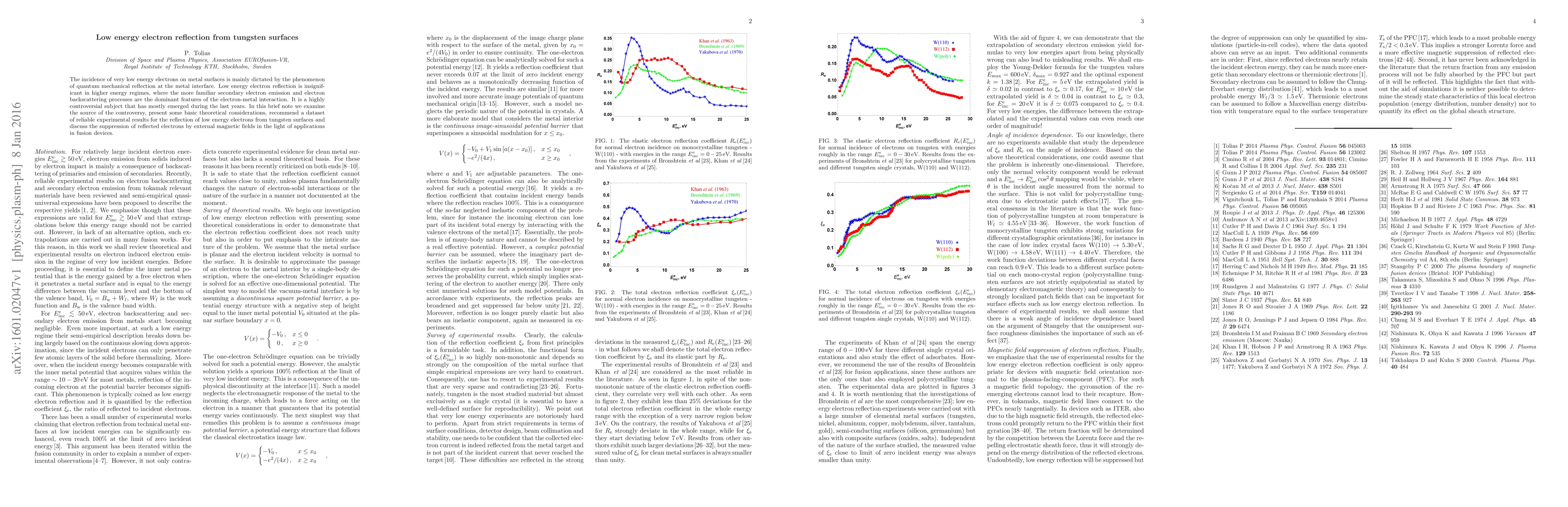 The incidence of very low energy electrons on metal surfaces is mainly dictated by the phenomenon of quantum mechanical reflection at the metal interface. Low energy electron reflection is insignificant in higher energy regimes, where the more familiar secondary electron emission and electron backscattering processes are the dominant features of the electron-metal interaction. It is a highly controversial subject that has mostly emerged during the last years. In this brief note we examine the source of the controversy, present some basic theoretical considerations, recommend a dataset of reliable experimental results for the reflection of low energy electrons from tungsten surfaces and discuss the suppression of reflected electrons by external magnetic fields in the light of applications in fusion devices.