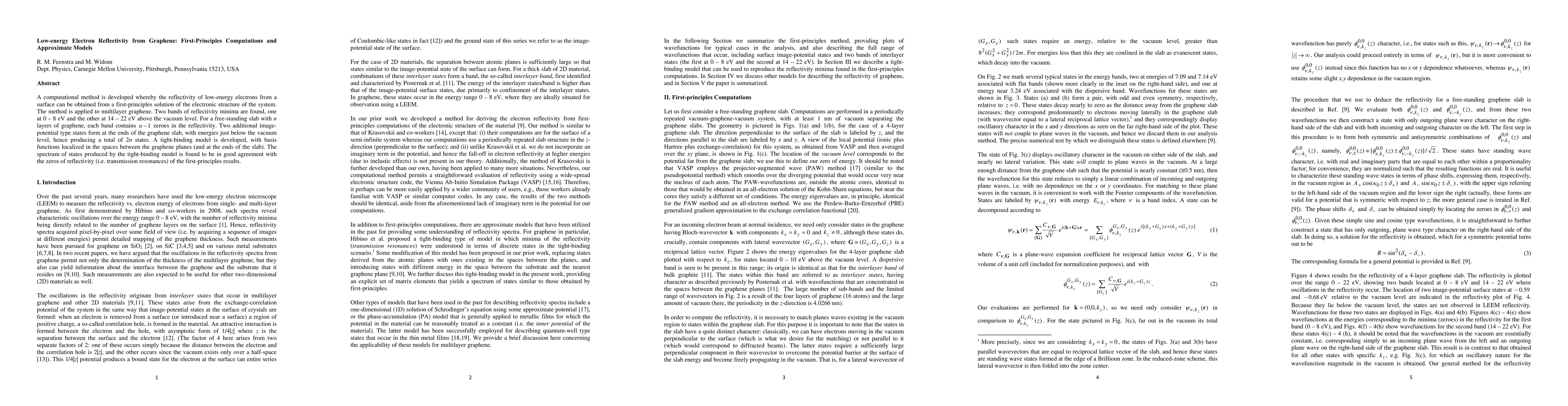 Researchers developed a method to calculate low-energy electron reflectivity from graphene using first-principles calculations and a tight-binding model, finding two bands of reflectivity minima at 0-8 eV and 14-22 eV above the vacuum level.