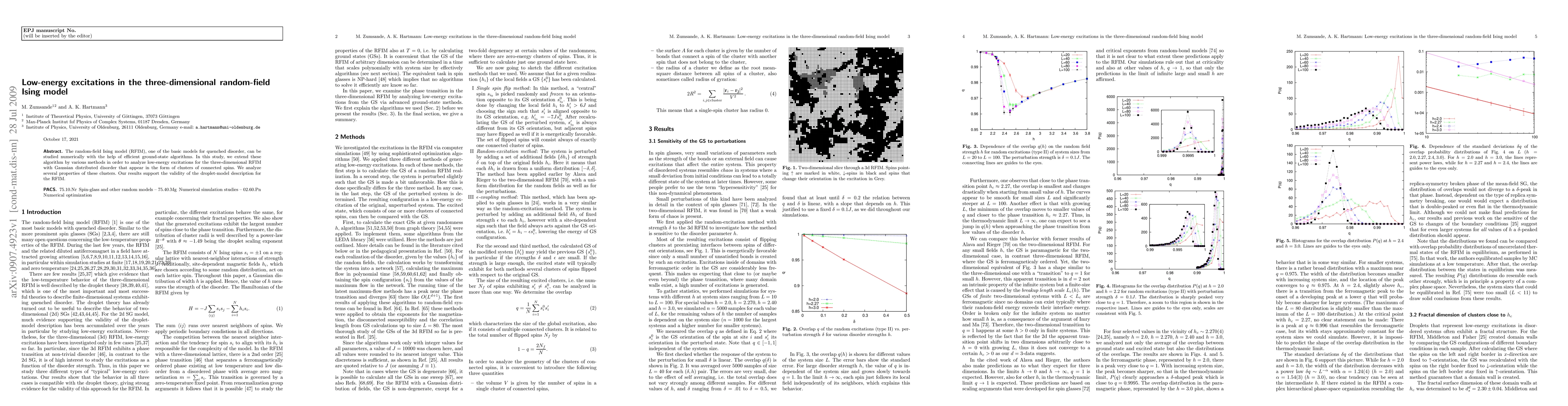 This study analyzed low-energy excitations in a 3D random-field Ising model with Gaussian disorder, supporting the droplet-model description for the model. It also explored properties of clusters of connected spins in these excitations.