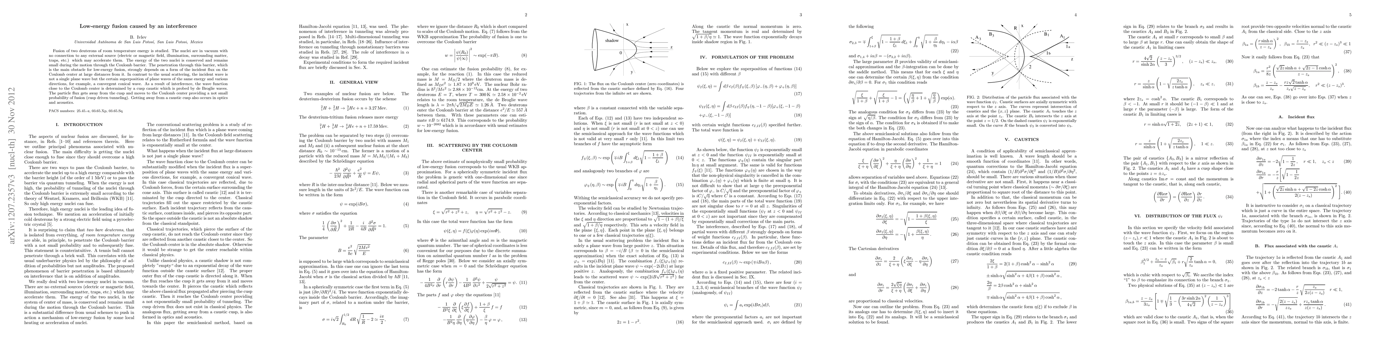 Fusion of two deuterons of room temperature energy is studied. The nuclei are in vacuum with no connection to any external source (electric or magnetic field, illumination, surrounding matter, traps, etc.) which may accelerate them. The energy of the two nuclei is conserved and remains small during the motion through the Coulomb barrier. The penetration through this barrier, which is the main obstacle for low-energy fusion, strongly depends on a form of the incident flux on the Coulomb center at large distances from it. In contrast to the usual scattering, the incident wave is not a single plane wave but the certain superposition of plane waves of the same energy and various directions, for example, a convergent conical wave. As a result of interference, the wave function close to the Coulomb center is determined by a cusp caustic which is probed by de Broglie waves. The particle flux gets away from the cusp and moves to the Coulomb center providing a not small probability of fusion (cusp driven tunneling). Getting away from a caustic cusp also occurs in optics and acoustics.