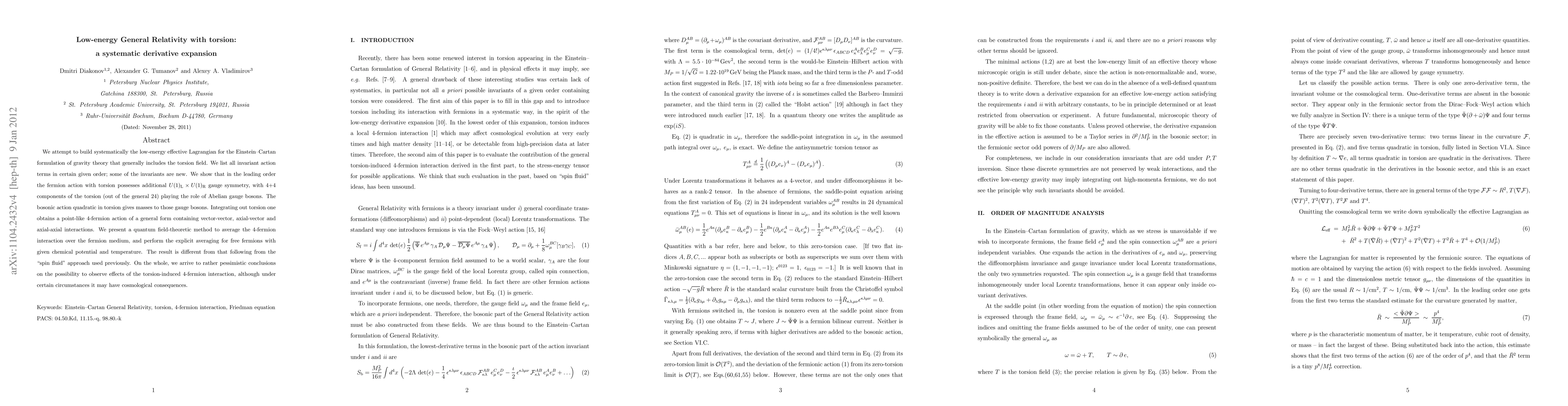 We attempt to build systematically the low-energy effective Lagrangian for the Einstein--Cartan formulation of gravity theory that generally includes the torsion field. We list all invariant action terms in certain given order; some of the invariants are new. We show that in the leading order the fermion action with torsion possesses additional U(1)_L x U(1)_R gauge symmetry, with 4+4 components of the torsion (out of the general 24) playing the role of Abelian gauge bosons. The bosonic action quadratic in torsion gives masses to those gauge bosons. Integrating out torsion one obtains a point-like 4-fermion action of a general form containing vector-vector, axial-vector and axial-axial interactions. We present a quantum field-theoretic method to average the 4-fermion interaction over the fermion medium, and perform the explicit averaging for free fermions with given chemical potential and temperature. The result is different from that following from the "spin fluid" approach used previously. On the whole, we arrive to rather pessimistic conclusions on the possibility to observe effects of the torsion-induced 4-fermion interaction, although under certain circumstances it may have cosmological consequences.