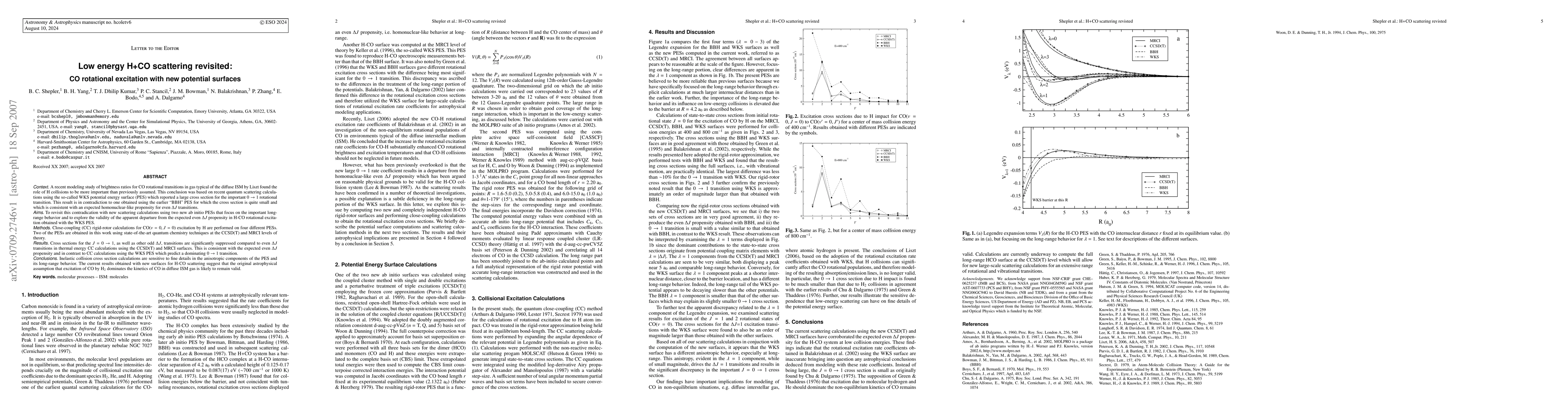 A recent modeling study of brightness ratios for CO rotational transitions in gas typical of the diffuse ISM by Liszt found the role of H collisions to be more important than previously assumed. This conclusion was based on quantum scattering calculations using the so-called WKS potential energy surface (PES) which reported a large cross section for the important 0->1 rotational transition. New close-coupling (CC) rigid-rotor calculations for CO(v=0,J=0) excitation by H are performed on four different PESs. Two of the PESs are obtained in this work using state-of-the-art quantum chemistry techniques at the CCSD(T) and MRCI levels of theory. Cross sections for the J=0->1, as well as other odd Delta J, transitions are significantly suppressed compared to even Delta J transitions in thermal energy CC calculations using the CCSD(T) and MRCI surfaces. This is consistent with a expected even Delta J propensity and in contrast to CC calculations using the earlier WKS PES which predict a dominating 0->1 transition. The current results suggest that the original astrophysical assumption that excitation of CO by H_2 dominates the kinetics of CO in diffuse ISM gas is likely to remain valid.