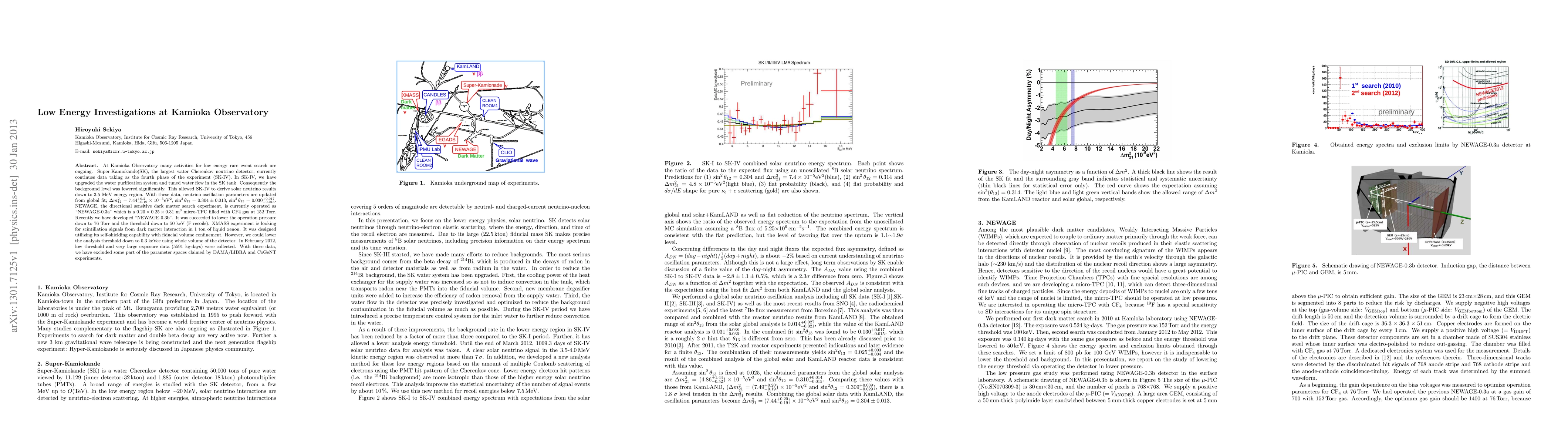 Kamioka Observatory's Super-Kamiokande (SK-IV) has significantly reduced background levels, enabling solar neutrino results down to 3.5 MeV and updating neutrino oscillation parameters. Additionally, the NEWAGE and XMASS experiments have advanced in dark matter detection, with NEWAGE lowering its operational pressure and detection threshold, and XMASS achieving a 0.3 keVee threshold, excluding some DAMA/LIBRA and CoGeNT claimed parameter spaces.