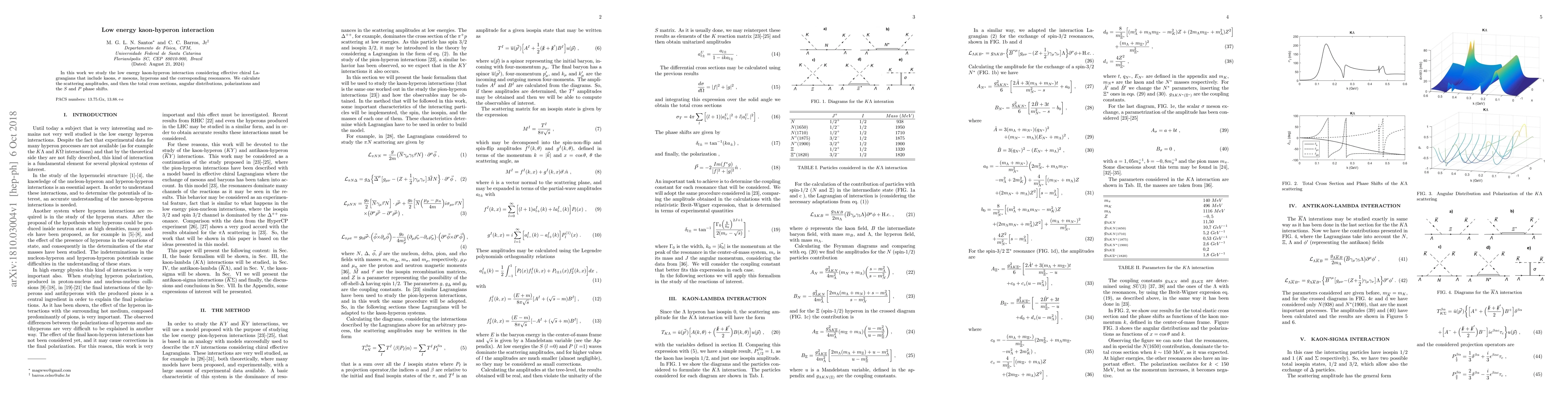This research investigates the low energy interaction between kaons and hyperons using effective chiral Lagrangians, calculating scattering amplitudes, cross sections, angular distributions, polarizations, and $S$ and $P$ phase shifts. The study aims to provide insights into the dynamics of these interactions.