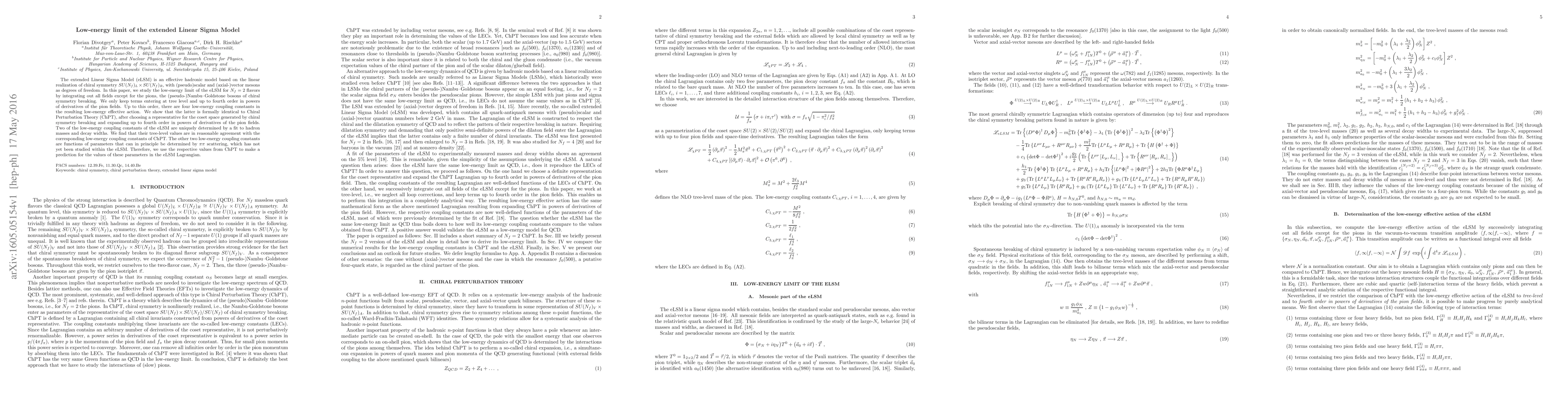This paper examines the low-energy limit of the Extended Linear Sigma Model (eLSM) for two flavors, integrating out all fields except pions. The resulting effective action matches Chiral Perturbation Theory (ChPT) up to fourth order in derivative powers. Two eLSM coupling constants are determined by fitting hadron masses and decay widths, agreeing with ChPT's values. The other two are predicted using ChPT parameters for ππ scattering, which remains unexplored in eLSM.