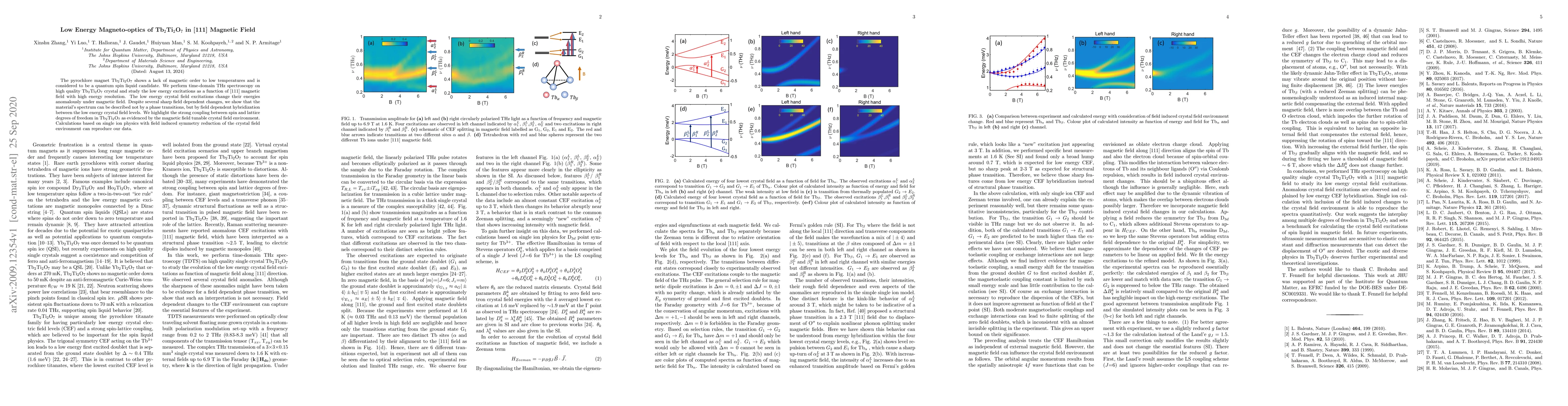 Researchers studied Tb2Ti2O7's low-energy excitations with magnetic fields using THz spectroscopy, finding that the material's crystal field environment changes under magnetic field, but not in a way that indicates a phase transition. Instead, they suggest strong coupling between spin and lattice degrees of freedom.