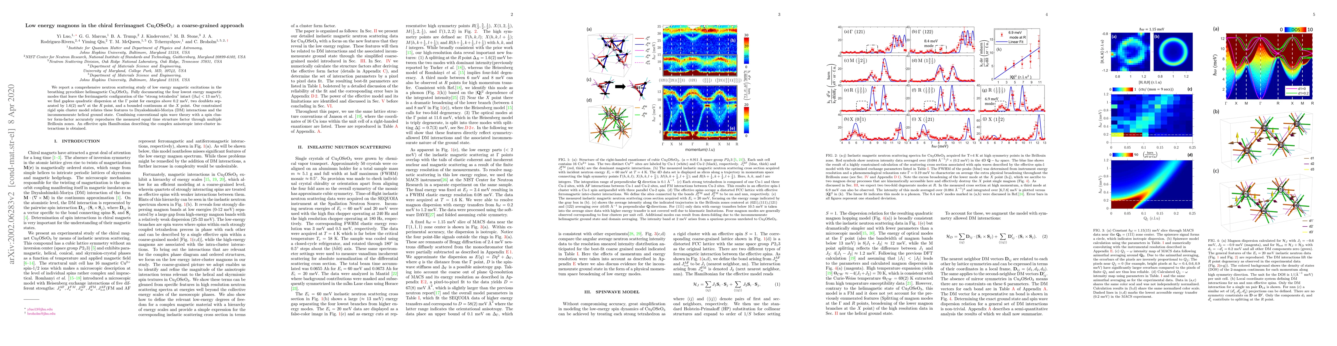 This paper presents a neutron scattering study of low energy magnetic excitations in $\text{Cu}_2\text{OSeO}_3$, revealing gapless quadratic dispersion and doublets linked to Dzyaloshinskii-Moriya interactions, and uses a spin cluster model to accurately reproduce the observed structure factor.