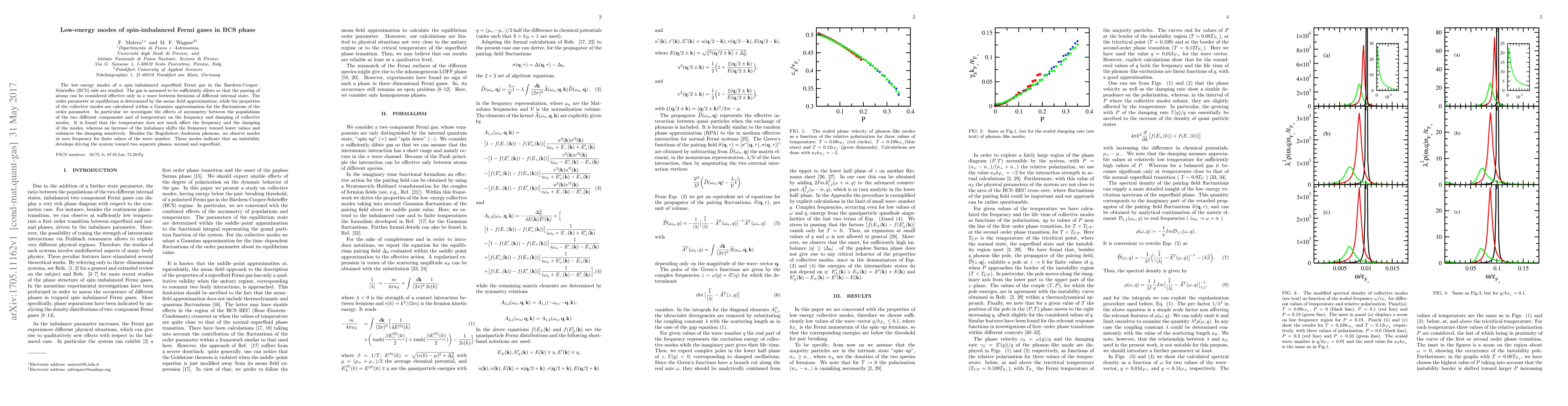 Research investigates low-energy modes of spin-imbalanced Fermi gases in BCS phase, finding that temperature has little effect on mode frequency but increasing imbalance lowers frequency and enhances damping, leading to potential instability towards two separate phases.